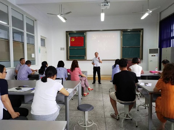 会议的最后,党总支书记杜瑜同志还带领全体党员共同学习习近平总书记在全国教师大会上的讲话,勉励各位老师继续发扬共产党人的优良作风,不忘入党初心、忠诚履职尽责,践行四讲四有,争做合格党员。