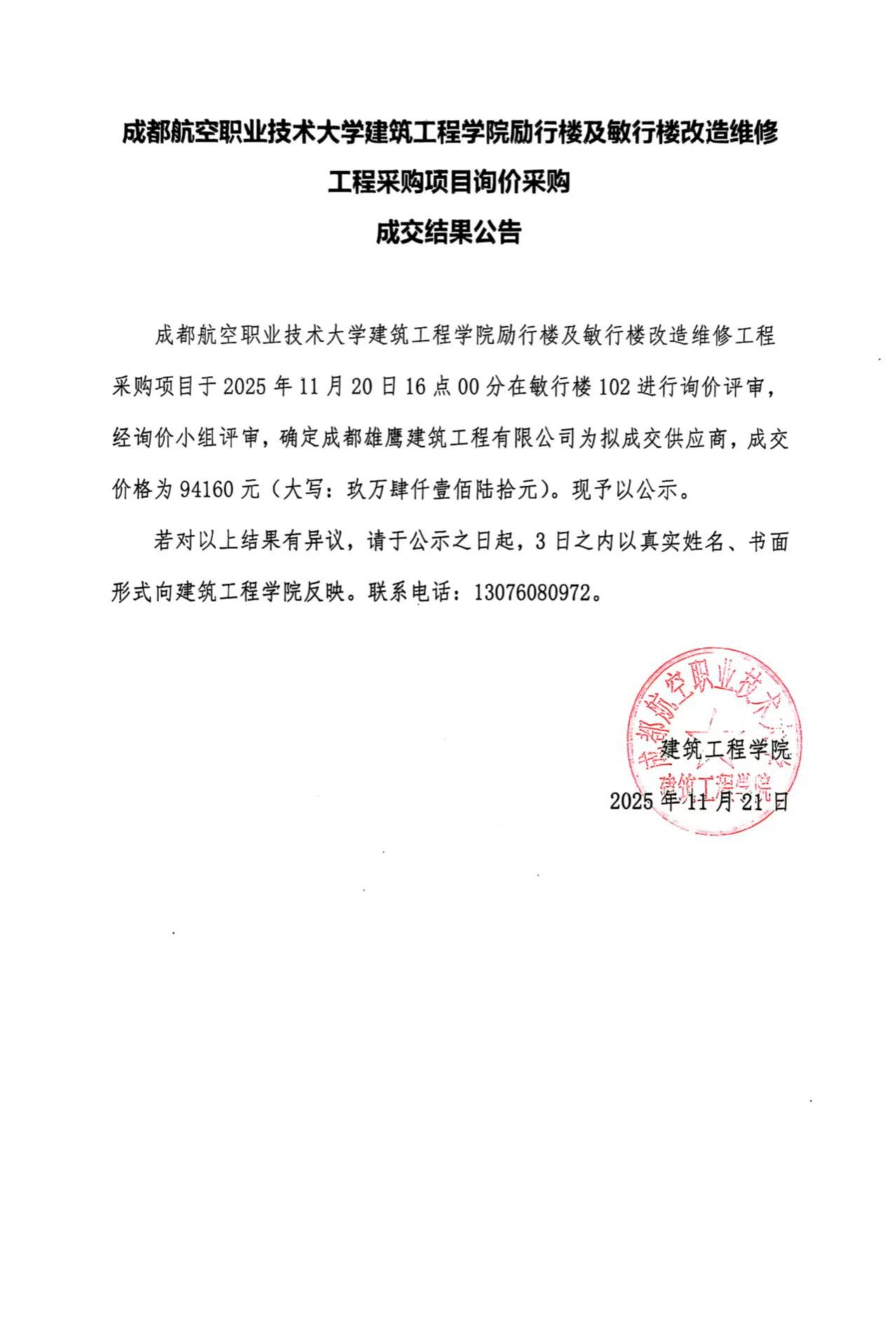 成都航空职业技术学院二级单位(部门)自行采购项目成交结果公告