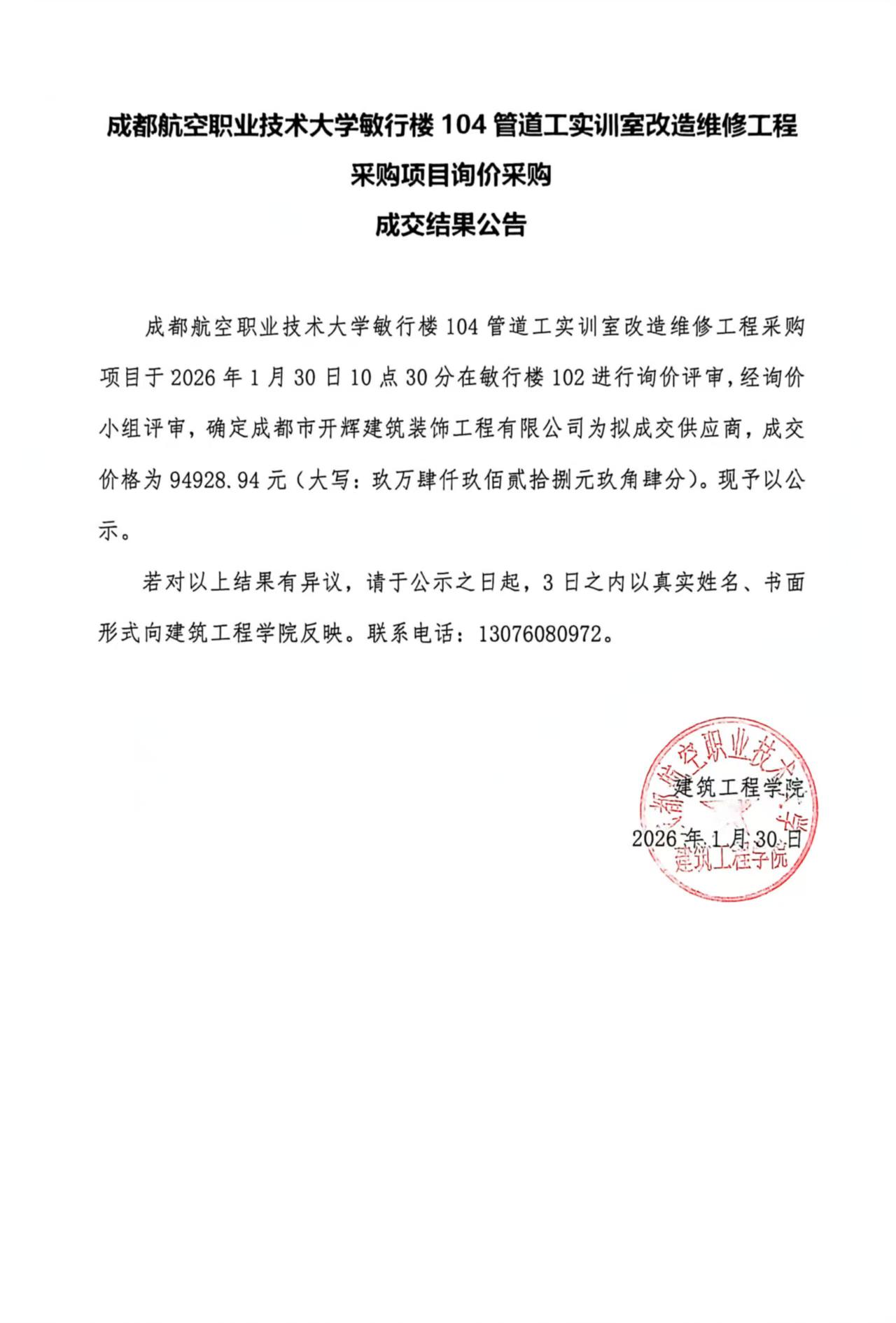 成都航空职业技术大学敏行楼104管道工实训室改造维修工程采购项目询价采购成交结果公告