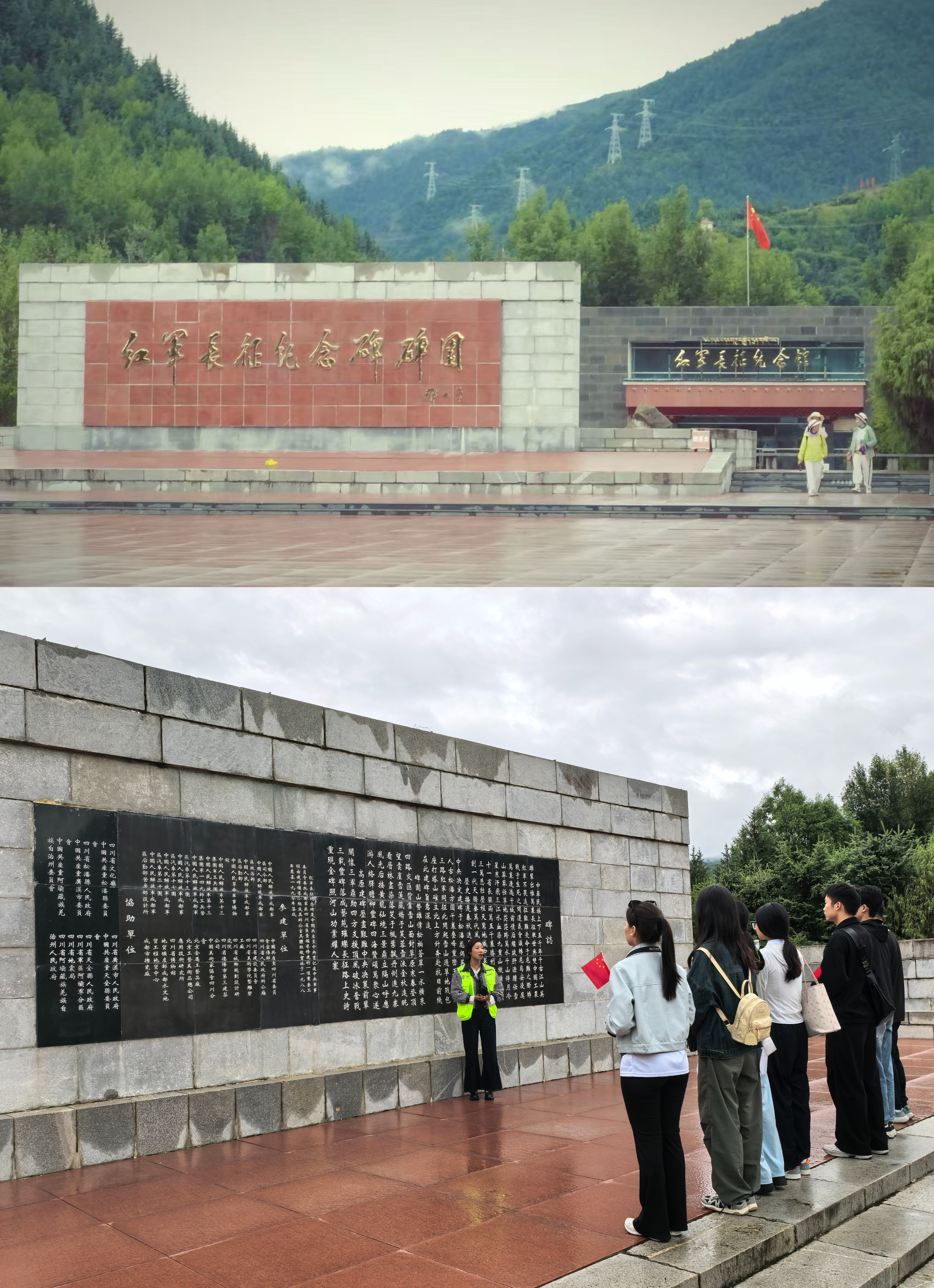 实践团队首站前往松潘县川主寺镇,参观了全国唯一纪念红军长征胜利的总碑园——红军长征纪念碑碑园。纪念馆内,泛黄的历史照片与斑驳的革命文物勾勒出长征路上各民族携手同心的壮阔史诗。通过讲解员的讲述与实物史料的研读,逐渐搭建起青年学子与革命历史对话的桥梁。团队以重走红色路线、撰写研学笔记、开展小组研讨等多元化形式,强化了对红色精神的理解与传承。“当指尖触到碑身‘红军长征纪念碑’七个大字时,609级台阶的厚重感让人忽然读懂,每一级都承载着先烈翻雪山、过草地的信念。” 一位队员在研学笔记中写道。