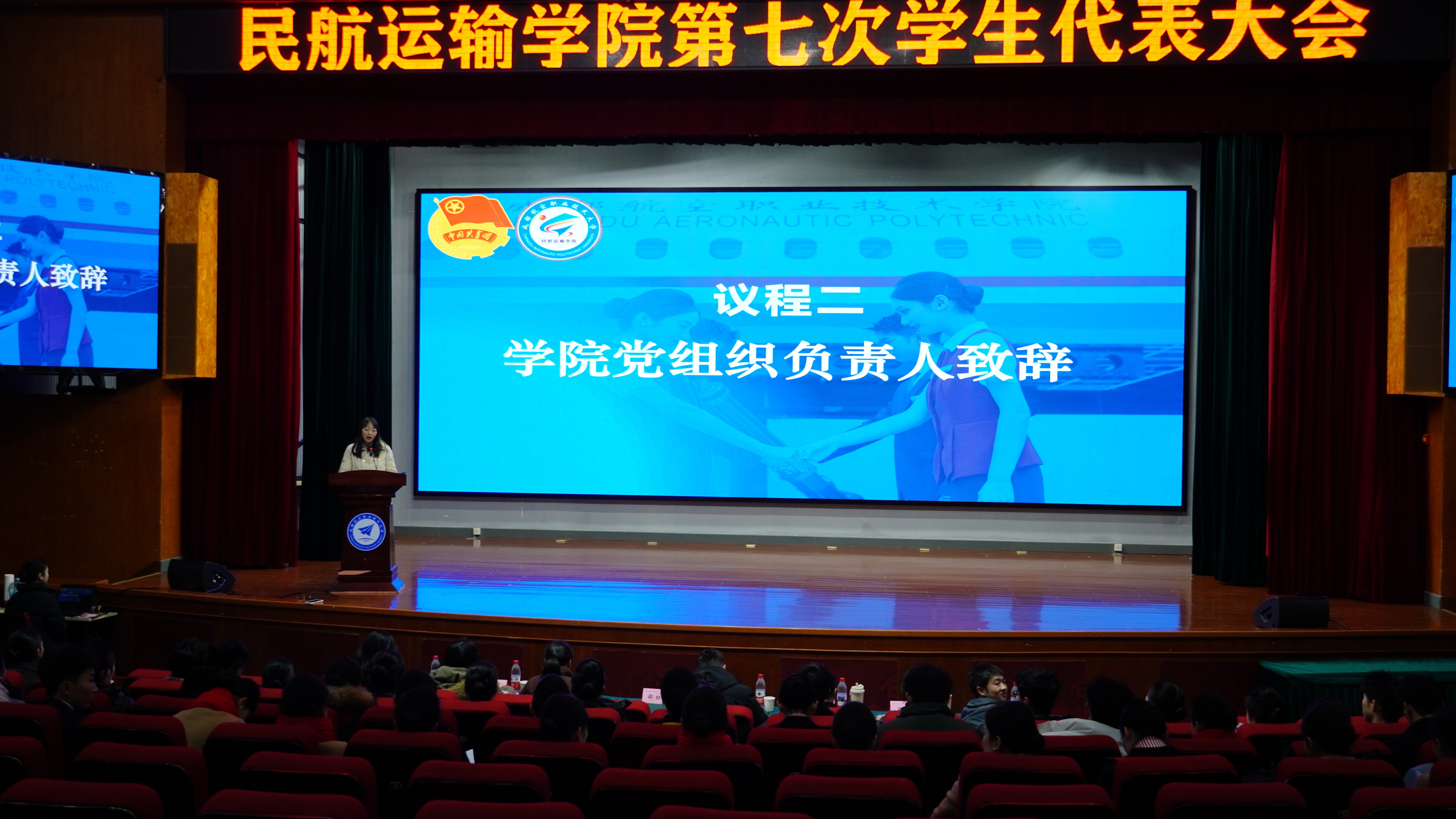 2026年1月6日,民航运输学院第七次学生代表大会在图书馆报告厅隆重举行。学院党组织负责人邵红梅、学生工作负责人闫天龙、团学工作指导老师及全院69名学生代表共同参与了本次大会,齐聚一堂凝聚共识,共话青春使命,擘画发展蓝图。