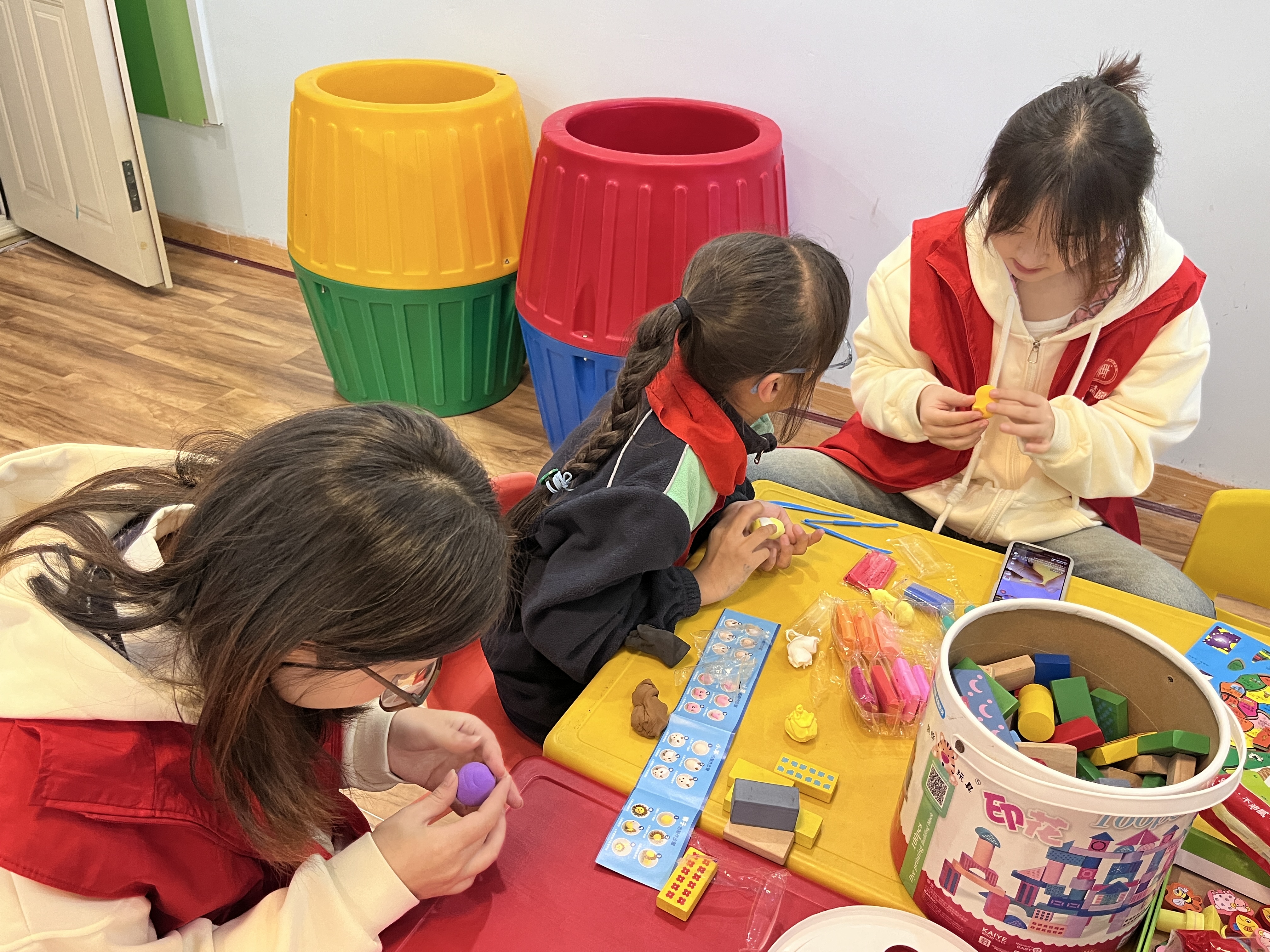 活动过程中,志愿者们共同与小朋友动手制作自己的彩泥作品。现场充满了欢声笑语,孩子们的创造力和想象力得到了充分的发挥。志愿者们则在旁边耐心地帮助解决小孩子在制作过程中遇到的问题。
