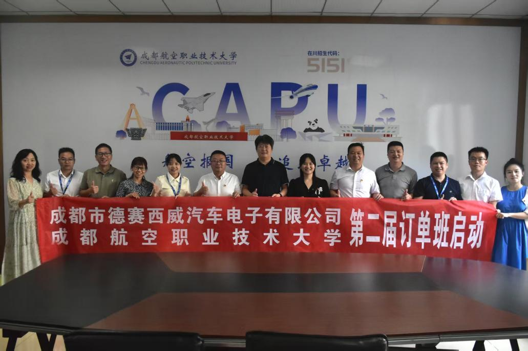 9 月 9 日下午,成都航空职业技术大学(以下简称:成都航大)与成都市德赛西威汽车电子有限公司(以下简称:成都市德赛西威)在图书馆副楼202会议室举行第二届订单班启动仪式。成都市德赛西威副总经理周晓彬一行,成都航大招生就业处、校企合作办公室、继续教育学院负责人马超及汽车工程学院、供应链管理学院相关领导出席仪式。
