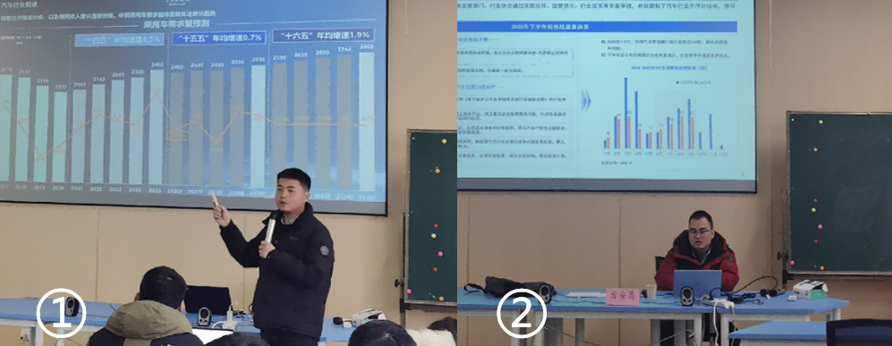 ①王勇做主题分享,②王勇和工作室成员做新能源汽车设备调研,