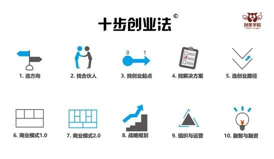 《十步创业法系列》:是中国第一个普惠创业教育系列。秉承 “普适、普惠、普世”的理念,把普适的方法论用普惠的价格普世化。这个系列包括10个1天的课程,每天的课程每个创业者只需要投资几百块钱,创客学院第一个让简单、实用、系统的创业教育进入百元时代!