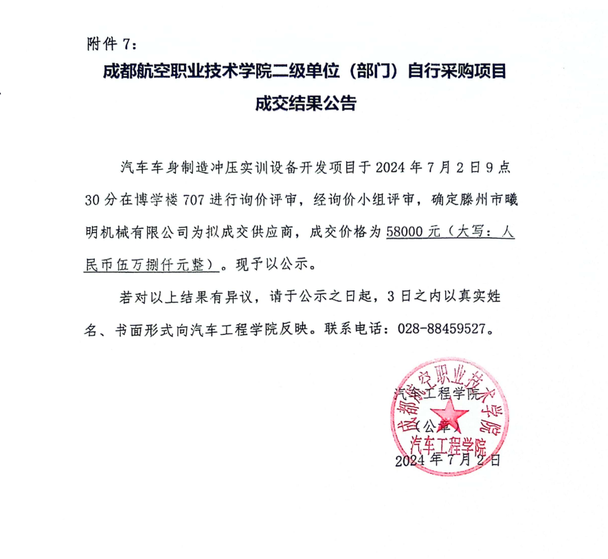 汽车车身制造冲压实训设备开发项目成交结果公告