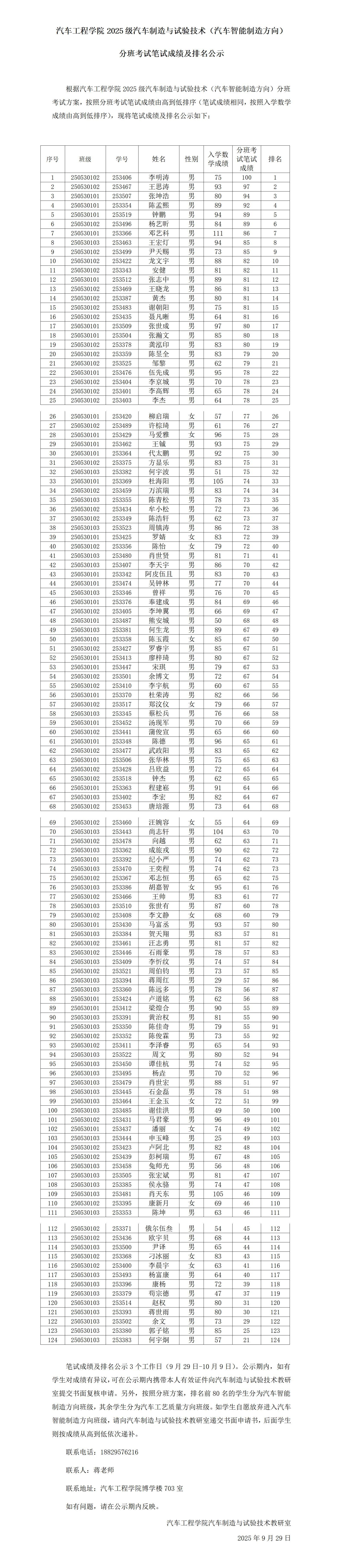 汽车工程学院2025级汽车制造与试验技术(汽车智能制造方向)分班考试笔试成绩及排名公示