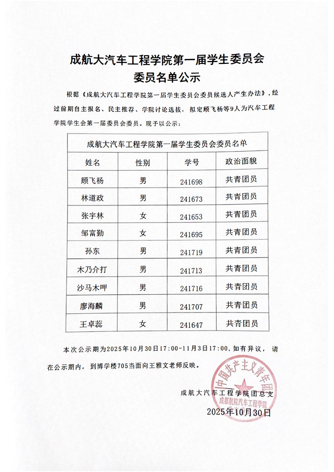 成航大汽车工程学院第一届学生委员会委员名单公示