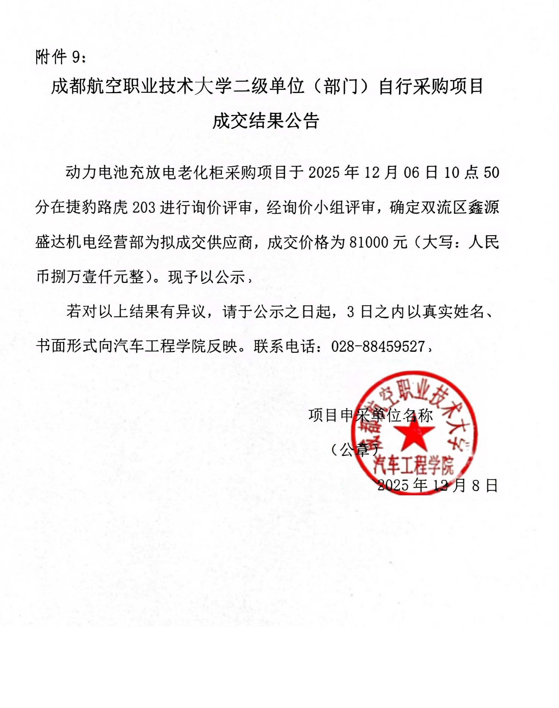 成都航空职业技术大学二级单位(部门)动力电池充放电老化柜采购项目成交结果公告