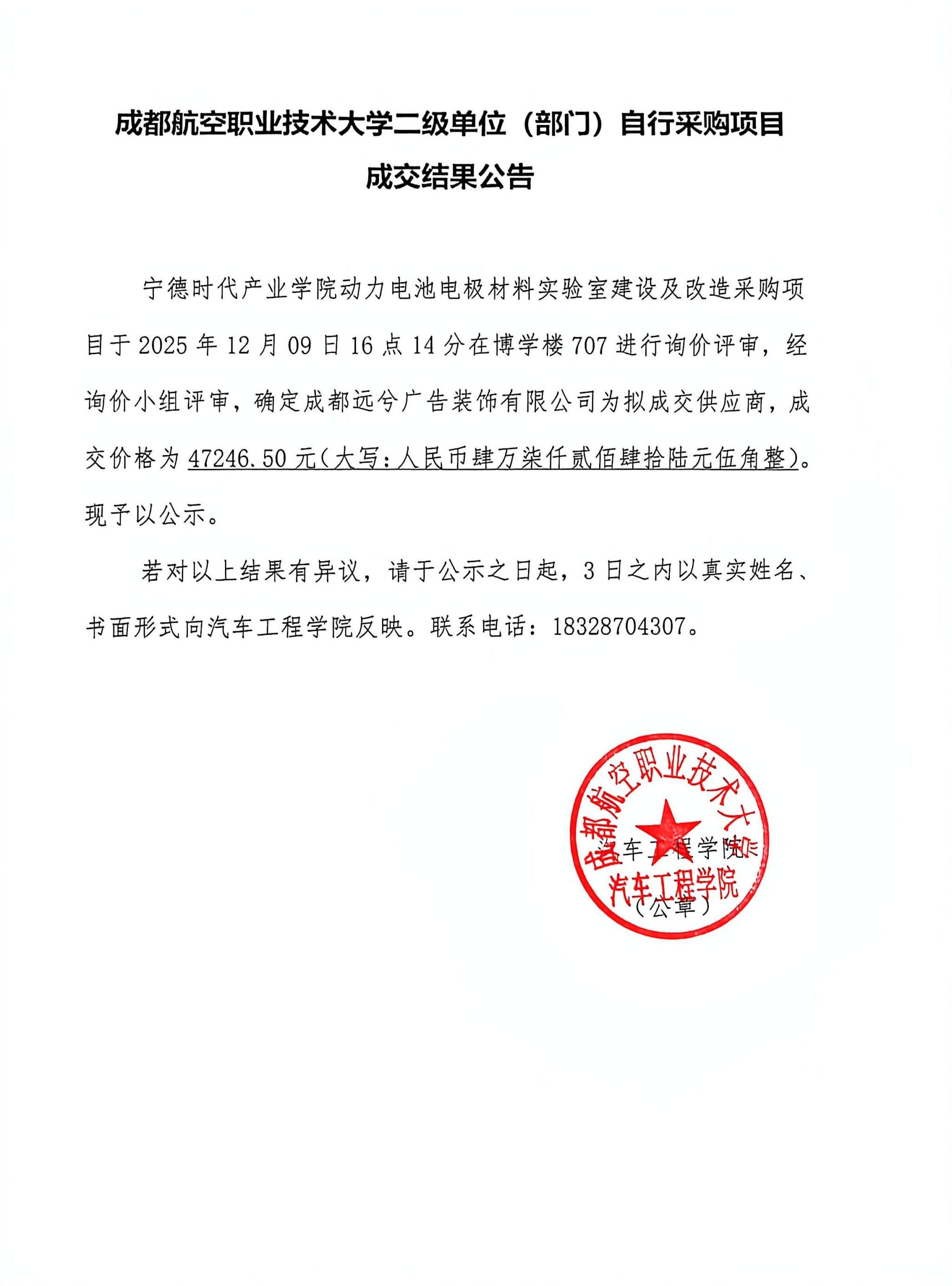汽车工程学院文化与科技体验中心建设采购项目成交结果公告