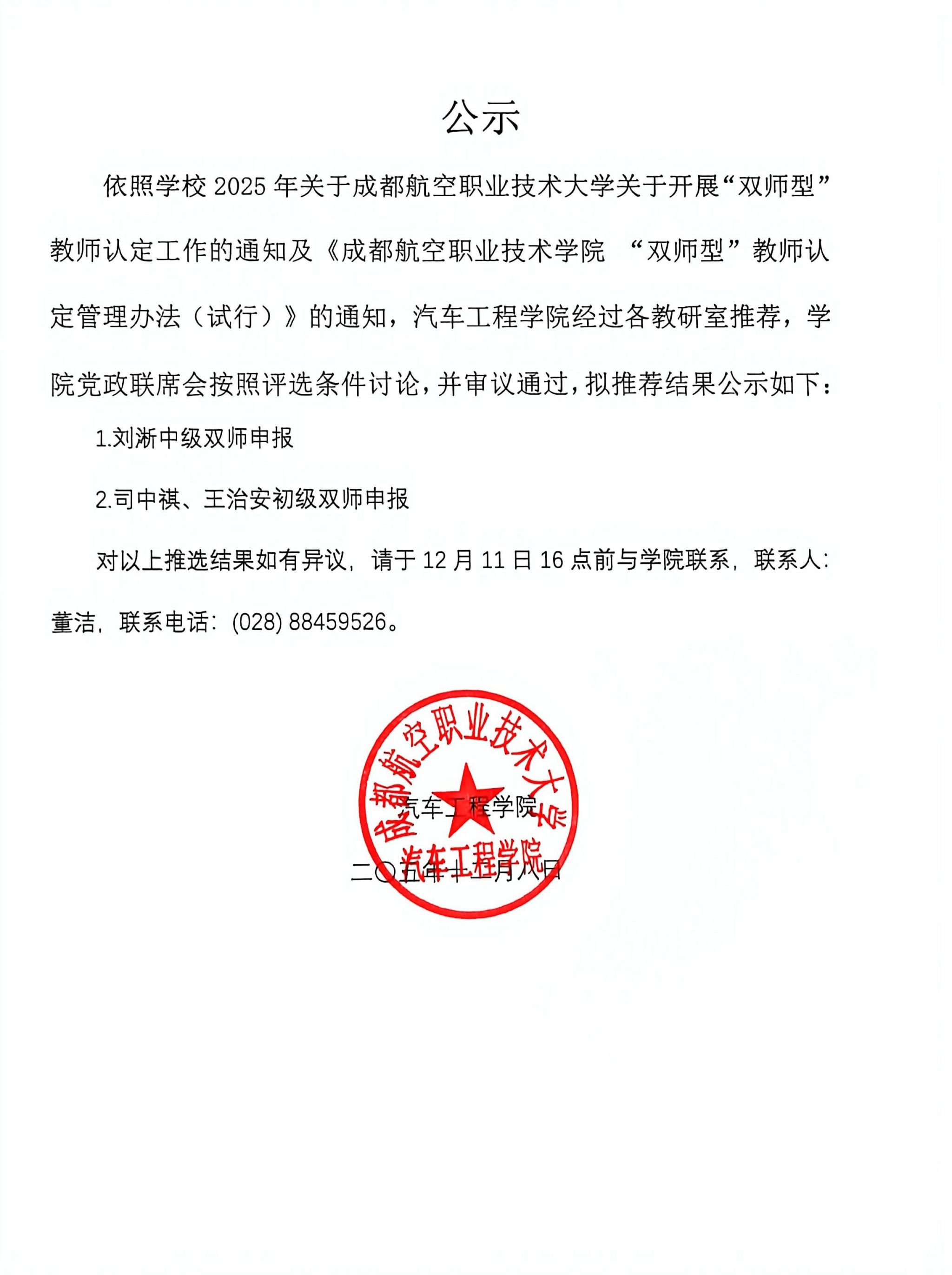 汽车工程学院关于“双师型”教师拟推荐结果公示
