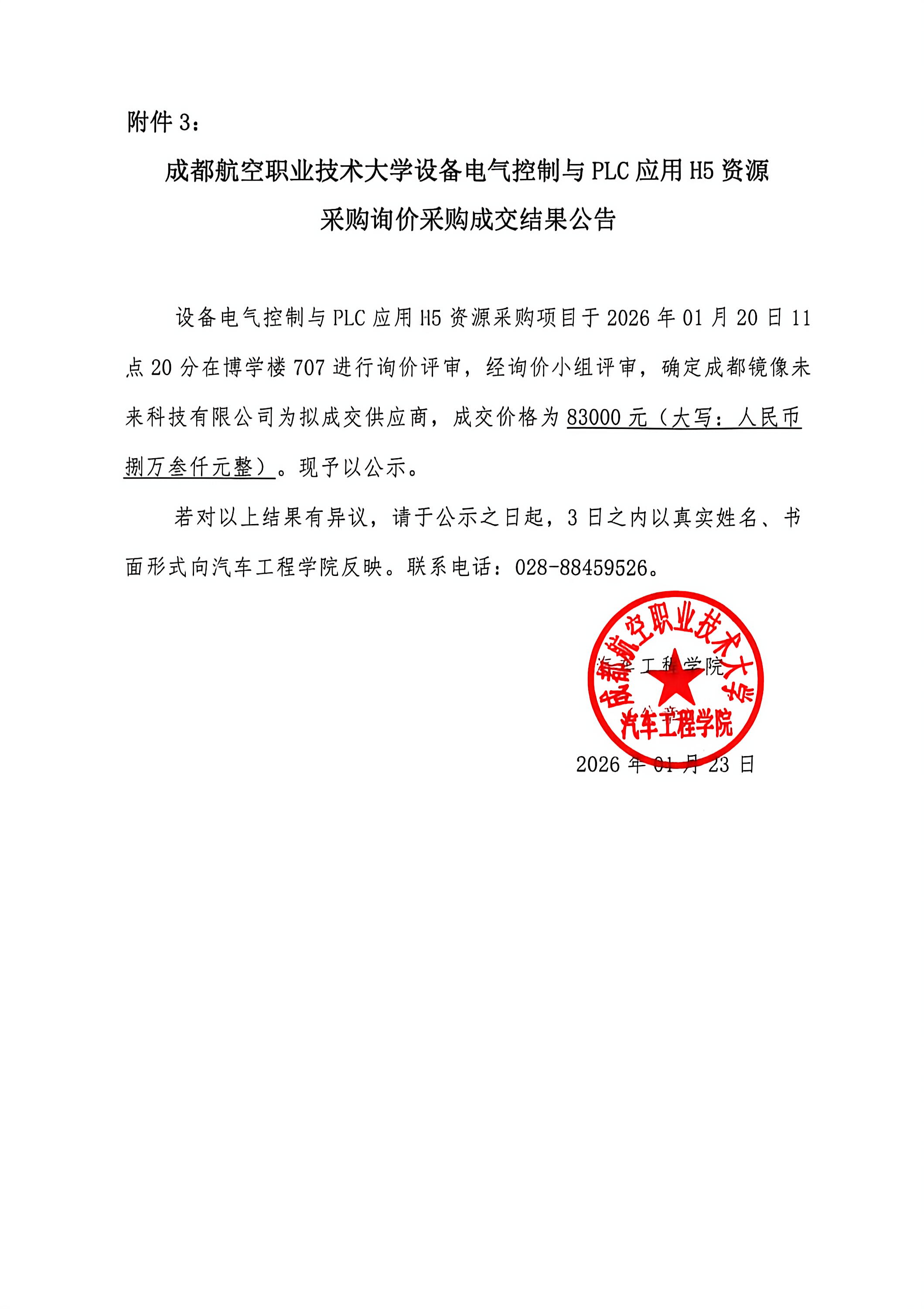 汽车工程学院关于设备电气控制与PLC应用H5资源采购询价成交结果公告