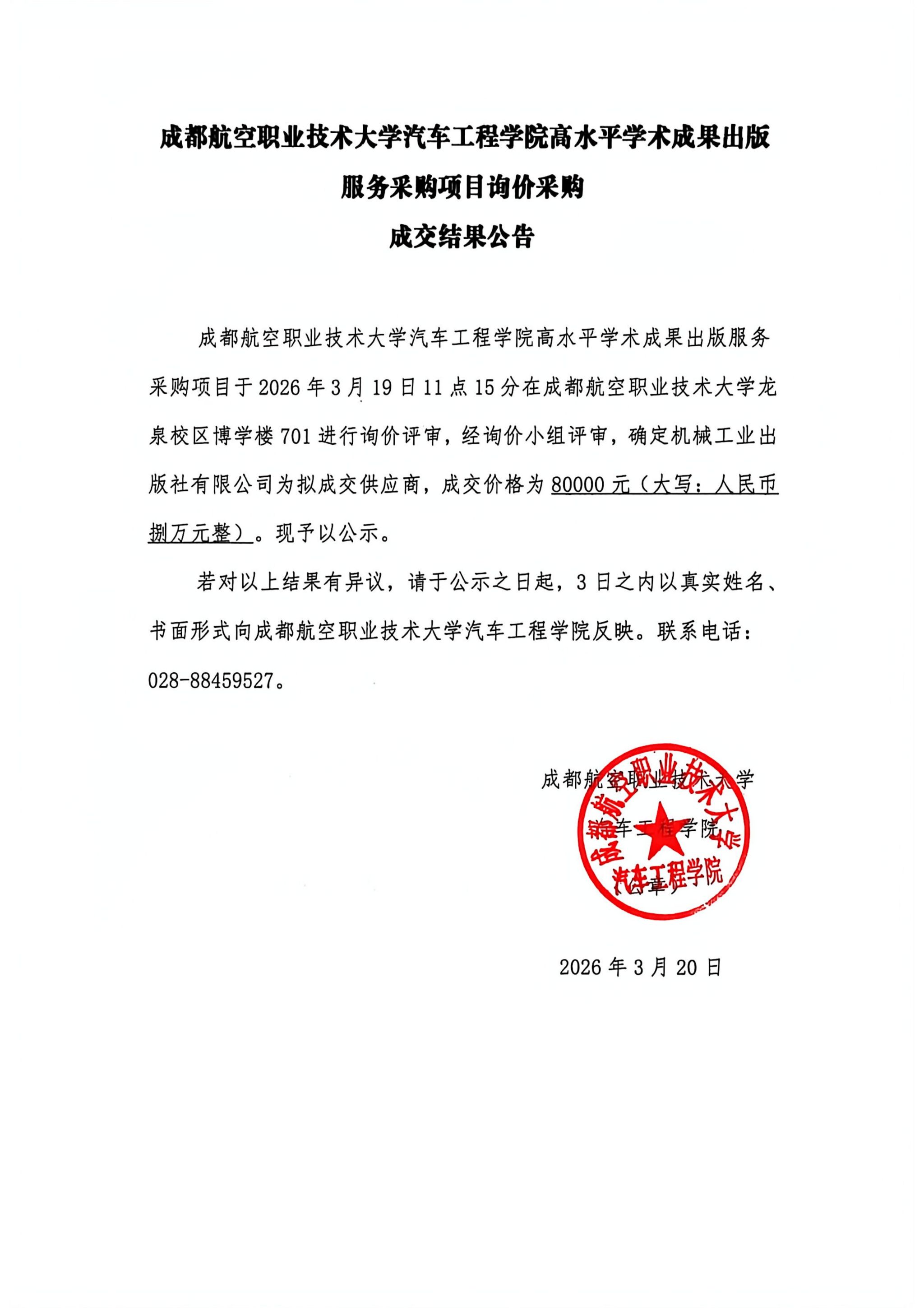 成都航空职业技术大学汽车工程学院高水平学术成果出版服务采购项目询价采购成交结果公告