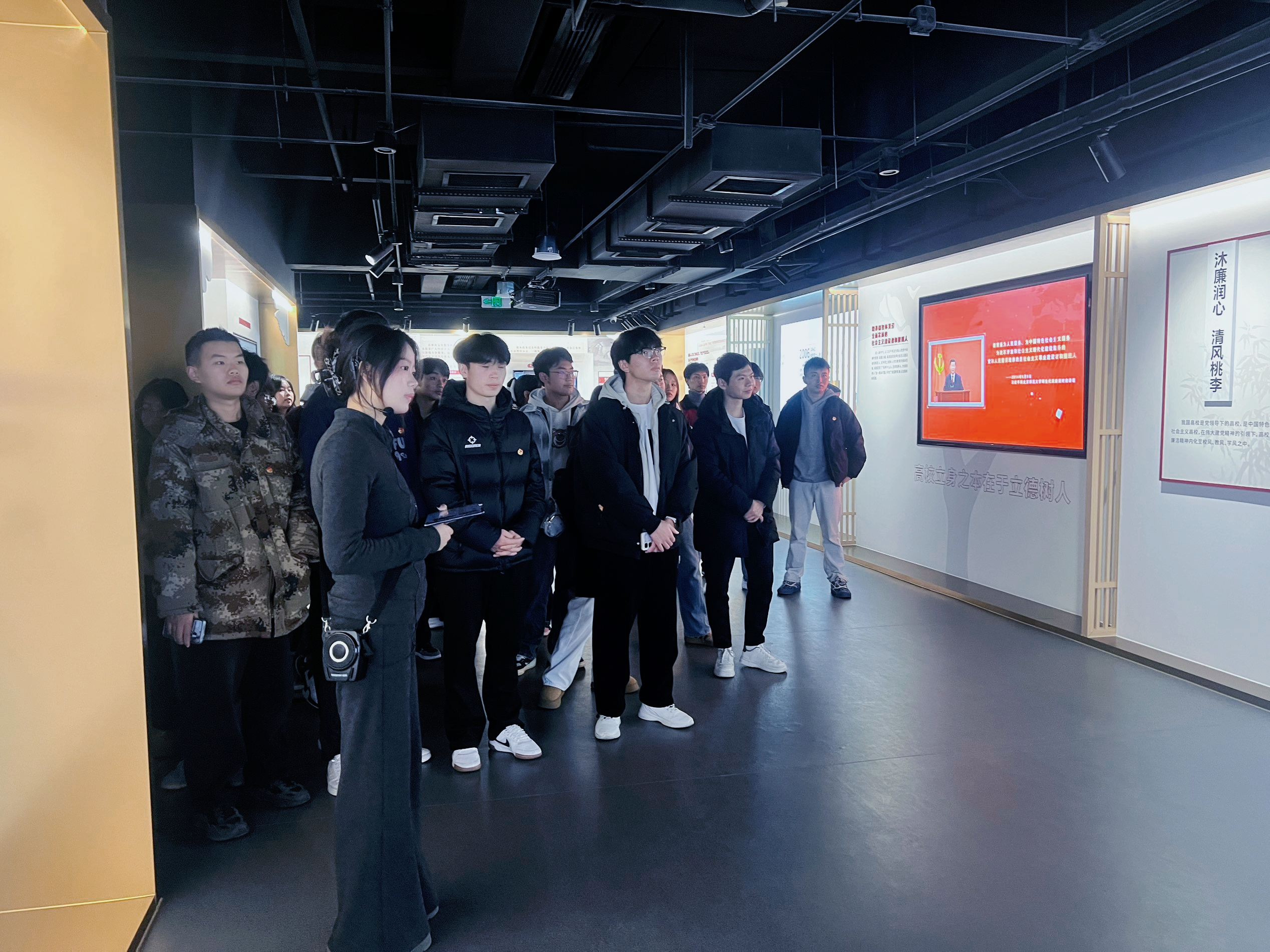 走进“育廉馆”,浓厚的廉洁氛围扑面而来。馆内一件件承载着廉洁记忆的展品、一幅幅生动鲜活的图片、一段段发人深省的影像资料,系统呈现了古今中外廉洁文化的发展脉络与时代内涵。在讲解员的细致引导下,师生们循着历史足迹,先后参观了廉洁典范、纪律规章、校园实践等多个展区。从古代先贤“克己奉公、清廉自守”的处世之道,到当代楷模“公私分明、甘于奉献”的责任担当;从党纪国法的严格规范,到校园里师生共同践行的廉洁准则,每一段故事都令人动容,每一个场景都引人深思。同学们边听边记、边看边思,不时围绕展区内容交流感悟。