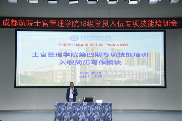 9月18日晚上,学院邀请学校职业生涯规划中心简历讲师——孔萍于博学楼报告厅为我院18级学员进行简历制作说明会。出席本次讲座的还有士官管理学院副政委梁潘,政治工作处副主任江奕其。