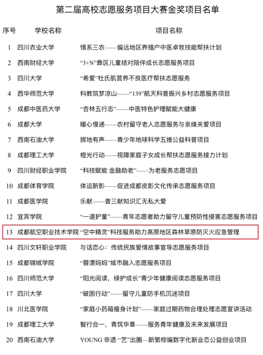 本届志愿服务项目大赛主题为“青春志愿行 建功新时代”,旨在发掘培育一批创新型、有实效的志愿服务项目,以赛代训,提升志愿服务的活力和专业化水平。决赛当天,全省55所高校130个项目负责人逐一介绍项目的运行管理、实施成效和社会影响。本次竞赛中,无人机产业学院推报的“‘空中精灵’科技服务助力高原地区森林草原防灭火应急管理”项目获得大赛金奖,管理学院推报的“多耕计划——民族地区大学生返乡就业志愿服务工作室”、军士管理学院推报的“‘职教追梦’——红心军匠志愿宣讲”项目获得大赛银奖,信息工程学院推报的“‘石榴花开、筑梦木里’——民族地区乡村振兴志愿服务”项目获得大赛铜奖,学校荣获“优秀组织奖”。据悉,在本次大赛中获金奖的项目将全部纳入四川青年志愿服务基金2023年度第一批支持项目。