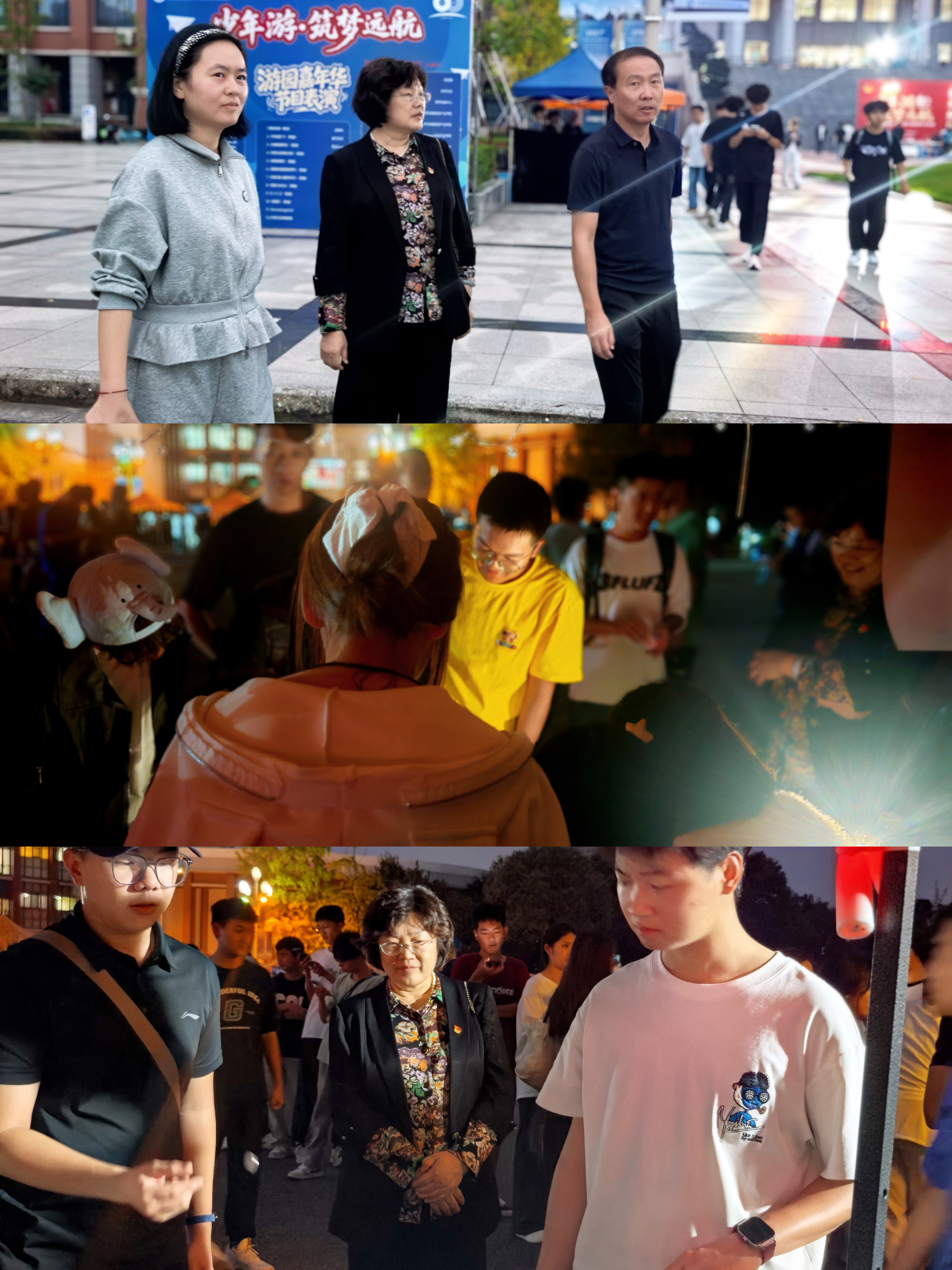 10月16日晚,龙泉校区率先拉开嘉年华序幕。学校党委书记陈小红亲临现场,与同学们共同沉浸在校庆的欢乐氛围中,为这场青春盛会增添了温暖底色。夜幕降临,校园内灯火通明,摇身变为欢乐的海洋,多个互动游戏站点与社团展示点位依次排开,参与同学络绎不绝。陈小红书记沿着活动路线,逐一查看每个社团游园点位,从“反向指令”“筷子夹弹珠”等趣味游戏区,到社团特色展示台,她仔细询问各点位的活动设计、参与情况,不时驻足观看同学们的互动场景,与现场学子亲切交流,倾听大家的体验与感受。在游戏区,陈小红书记还主动参与到 “趣投沙包”“吹乒乓球过三杯” 等互动环节中,与同学们并肩挑战,现场笑声不断,气氛愈发热烈。