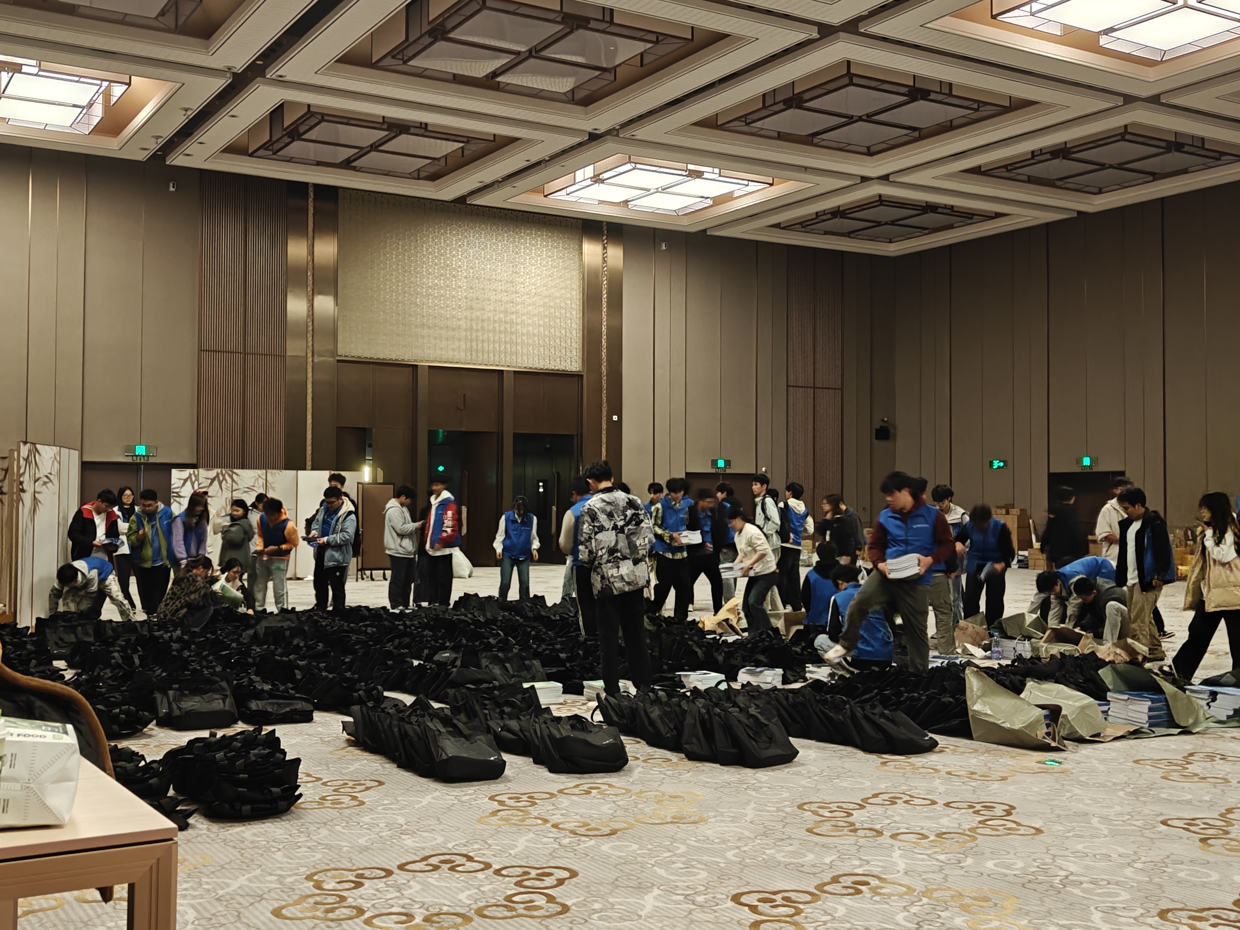 为确保服务质量,校团委联合相关二级学院,并与中国复合材料协会精心组织了系统化的岗前培训。10月23日,成航志愿者服务总队指导教师刘忻宜对志愿者们进行了全面动员,明确了各岗位职责、服务流程与工作要点。培训一结束,全体志愿者便立刻投身于紧张的准备工作,高效协作,在短时间内完成了1200余份会议物资的分装任务,为峰会的顺利开幕奠定了坚实基础。