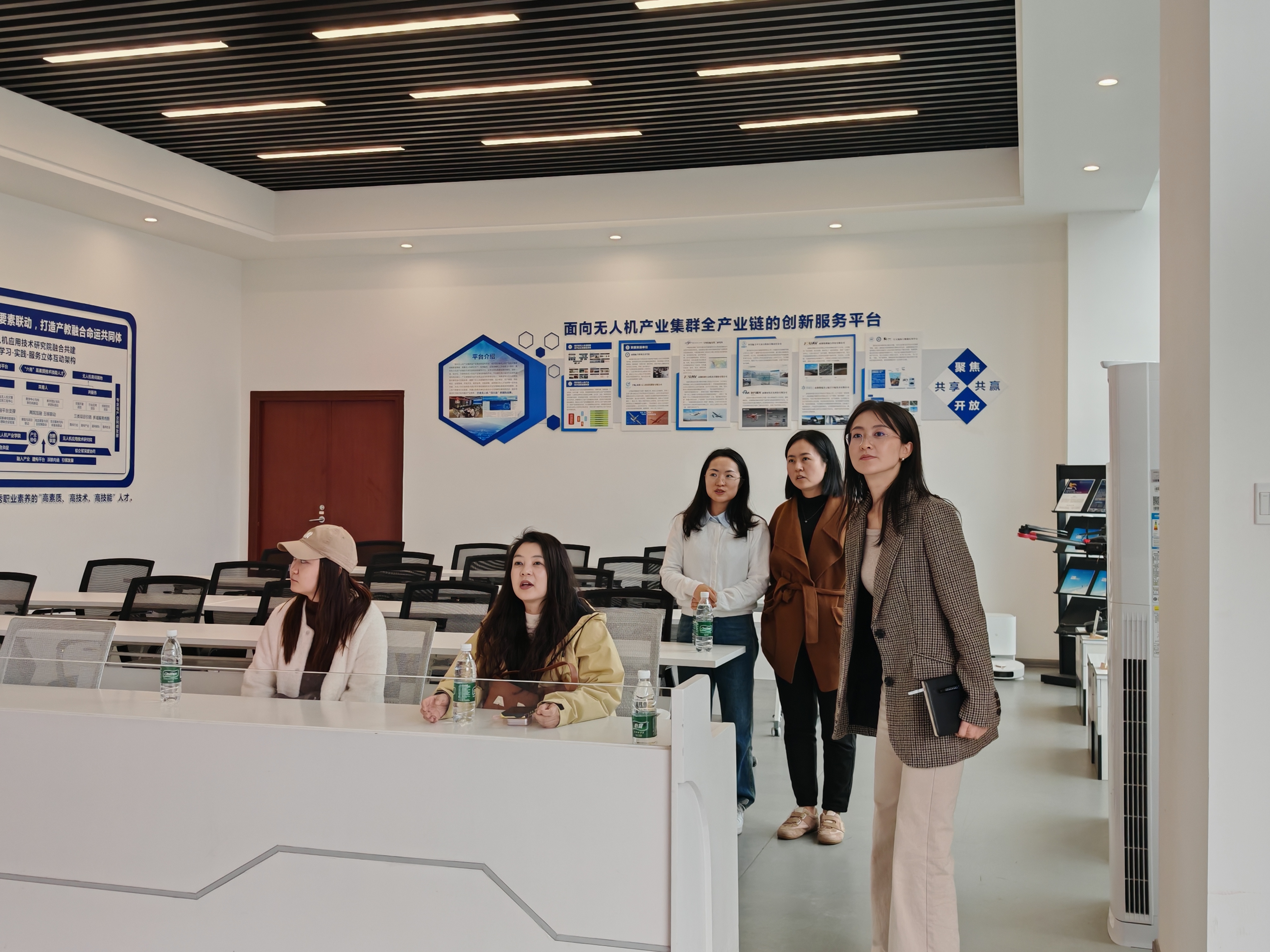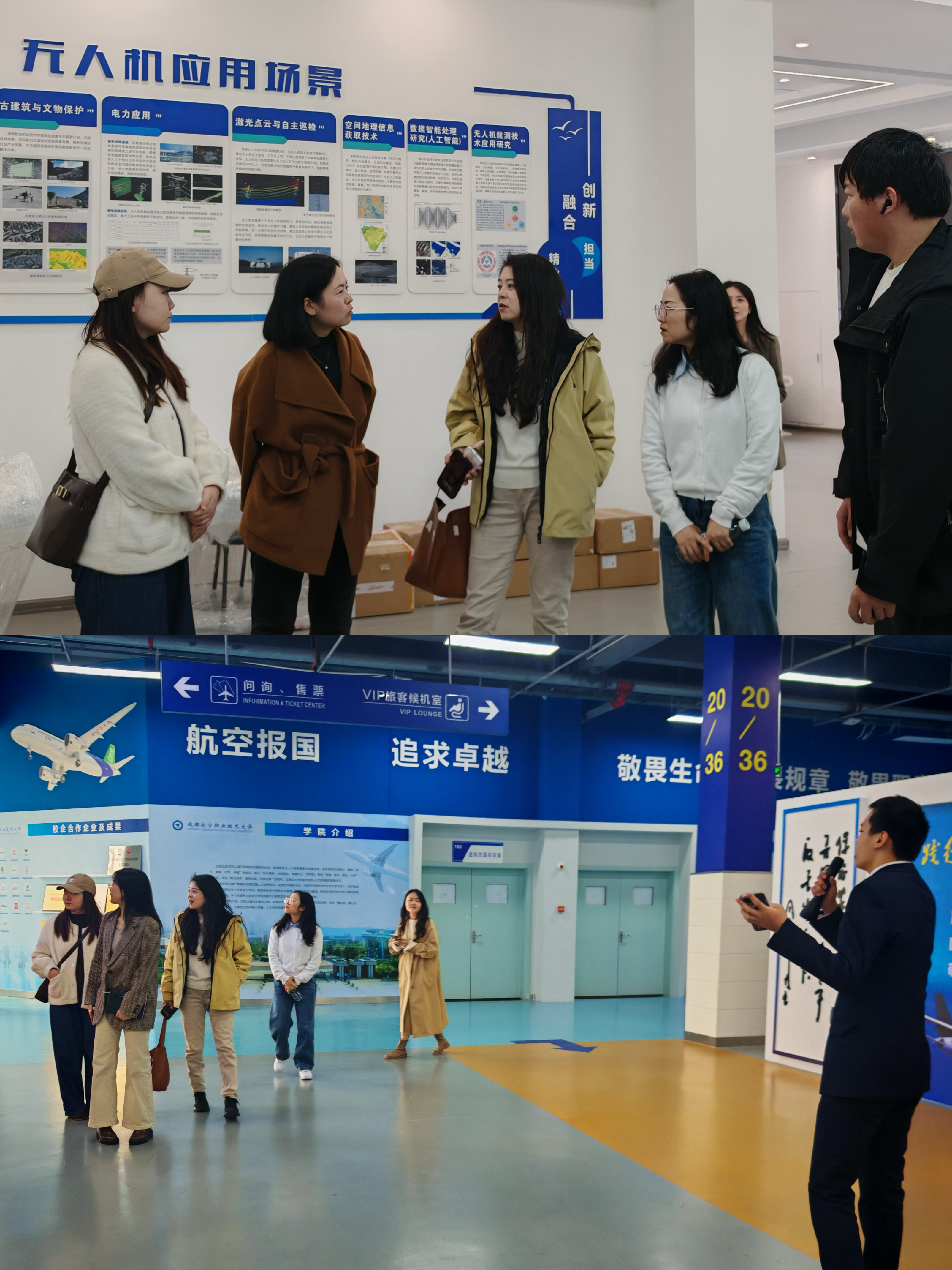 在校团委的引导和介绍下,调研组一行实地走访了申报材料中规划的“一坪两馆一基地一营地”核心实践区域。从停机坪上近距离感悟退役功勋战机的报国历史,到航空文化与无人机展馆内探索丰富的航模与科技设备,再到民航运输综合实训基地和定向培养军士生营地感受专业与专注。走访过程中,蒋晓敏详细汇报了筹备思路,她表示,学校旨在将“国防+航空”的独特优势转化为服务全市青少年的实践平台,这既是学校服务社会的功能延展,更是我校主动探索大中小学思政教育一体化建设的重要战略支点。为此,学院已围绕“爱国主义、航空文化、科技素养”三大核心,构建了“四大模块”的课程体系,并组建了“四位一体”的导师团队。