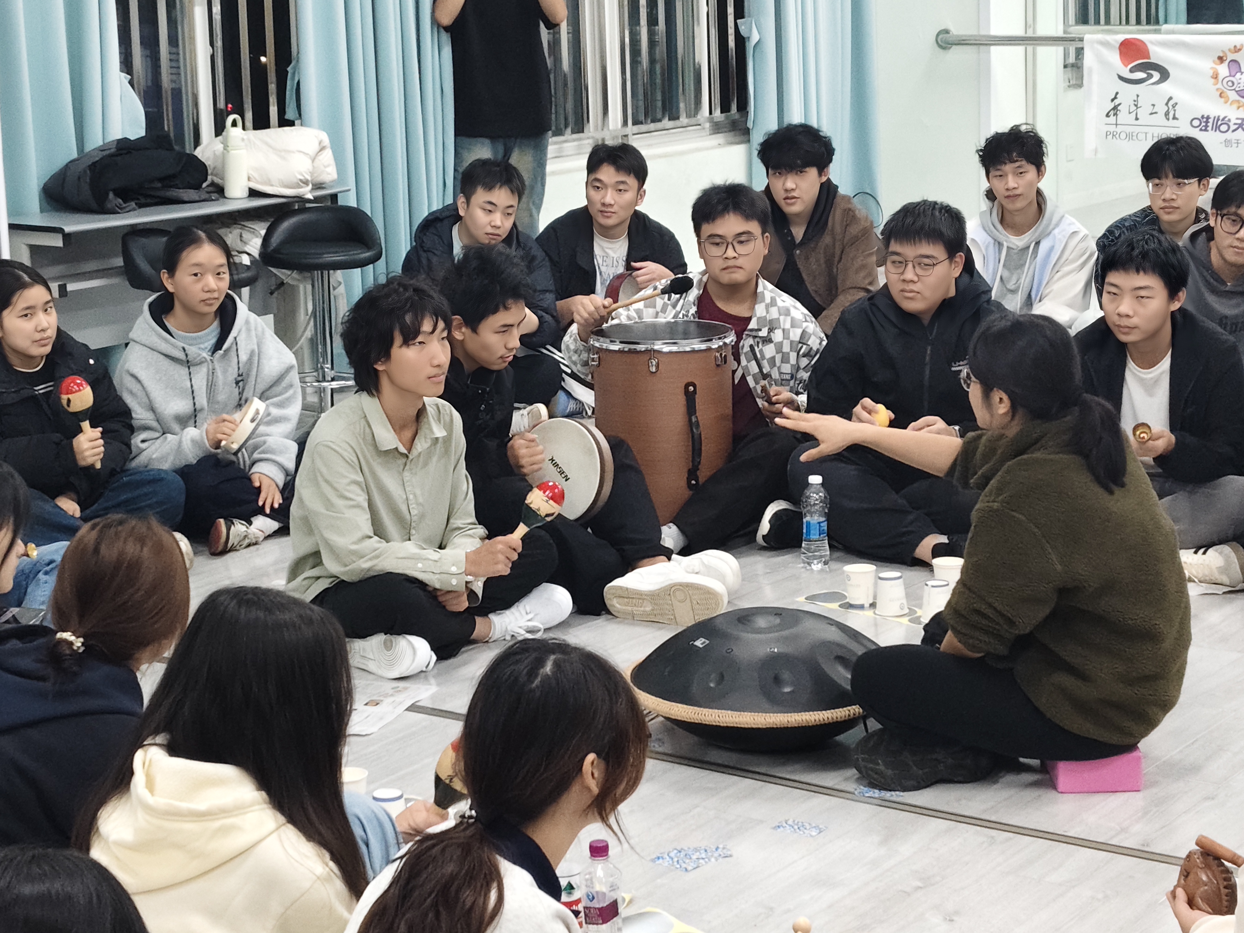 分享环节中,多名学生表达了参与感受。“跟着节奏敲击饭盒时,积压的焦虑仿佛随之消散,特别解压,”一名参与者分享道。另一位同学表示:“小组配合中的默契让人感到安心,原来压力可以这样轻松化解。”这些反馈体现了活动在情绪释放与团队联结方面的双重成效。