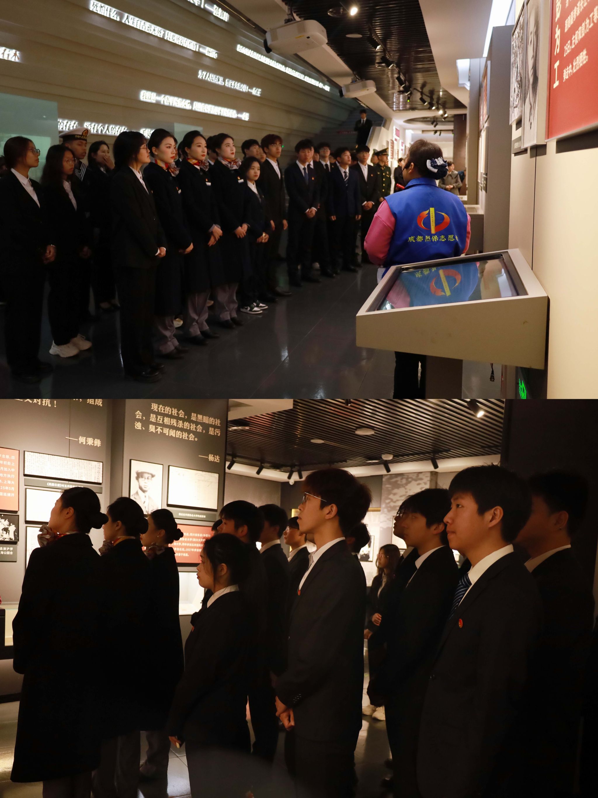 在解说员的带领下,全体师生在烈士陵园依次列队参观了从“保路运动”到“5.12汶川地震”九个展厅。每一件展品都承载着烈士们的奋斗与牺牲,让参与者仿佛穿越时空,亲身领略先烈们为实现国家独立、推动民族解放,前赴后继、浴血奋战的震撼场景。
