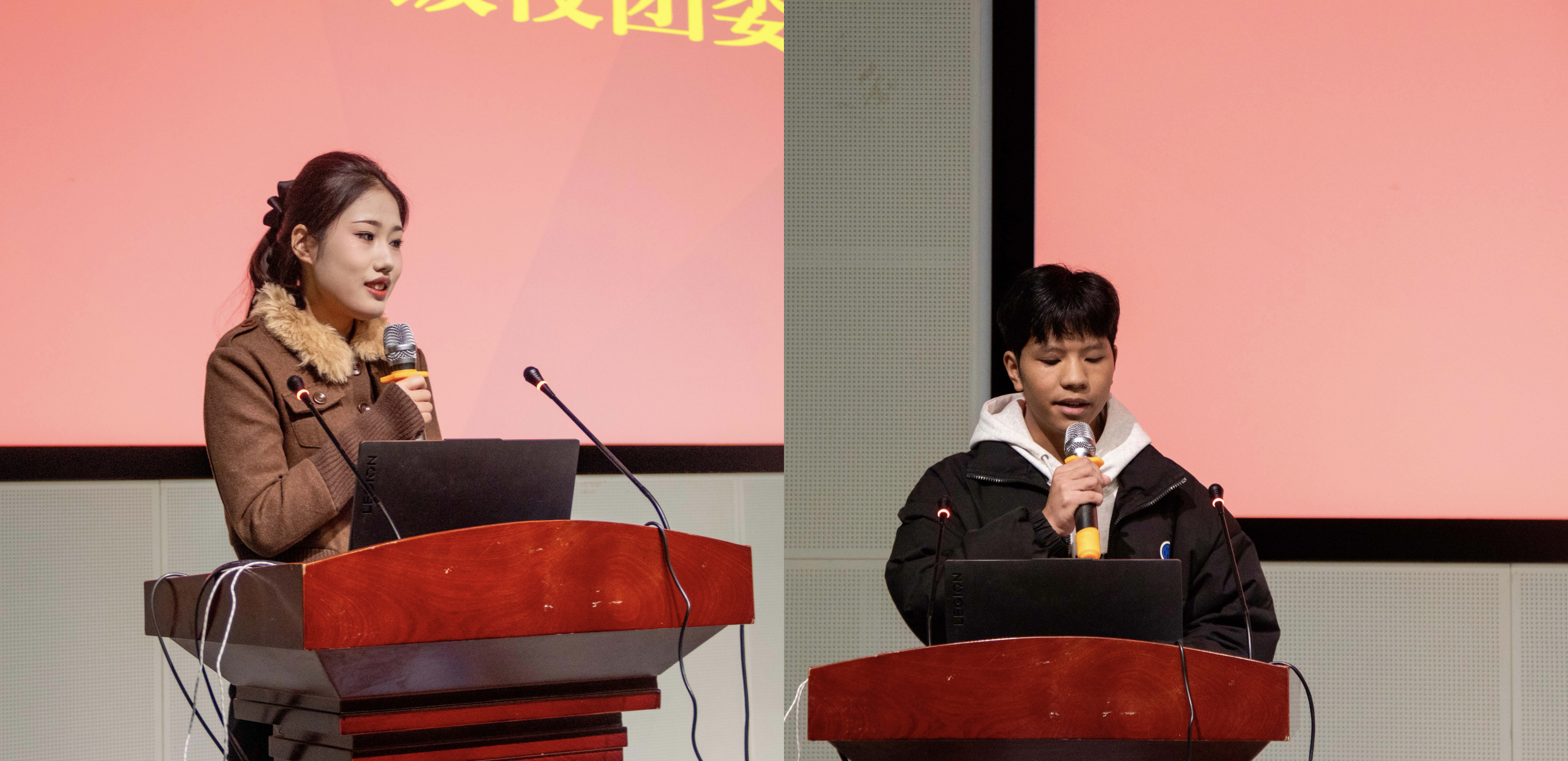 在代表发言环节,2023级青年传媒中心代表熊恒回顾了在团学组织中的成长与收获,表达了对组织的深厚感情,并寄语新骨干接续奋斗。2024级校学生会代表林建鑫在就职感言中表示,将坚定接过接力棒,加强学习、团结协作、勇于创新,努力服务同学,在实践中锻炼能力,在奉献中实现价值。