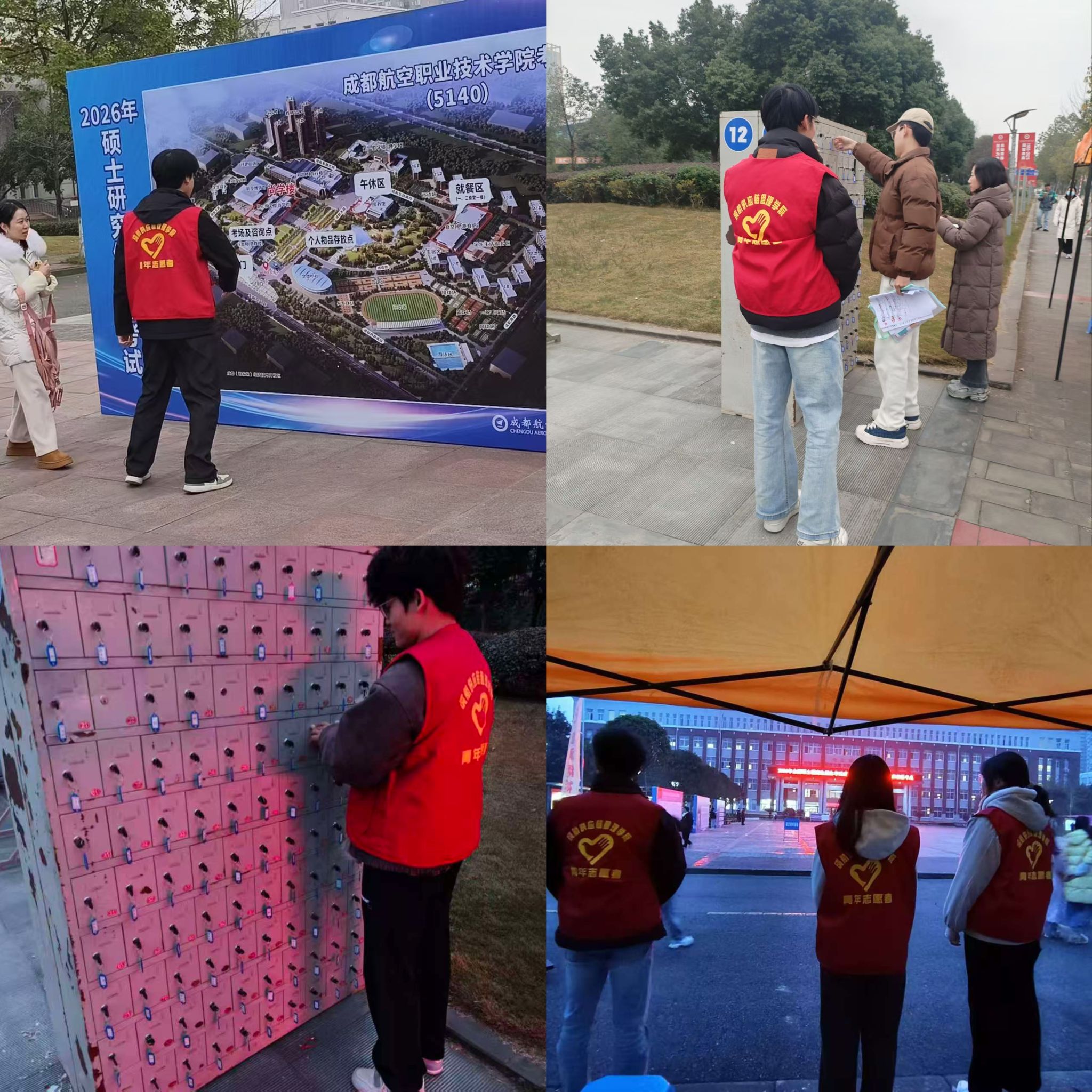 2025年12月21日,随着终考铃响,2026年全国硕士研究生招生考试成都航空职业技术大学考点志愿工作平安、顺利落幕。在校团委的精心组织下,军士管理学院、供应链管理学院志愿者队伍通力协作,以高度的责任感和温暖的奉献精神,圆满完成了为期两天的考试服务保障工作,为考研学子追逐梦想之路提供了坚实后盾与暖心陪伴。