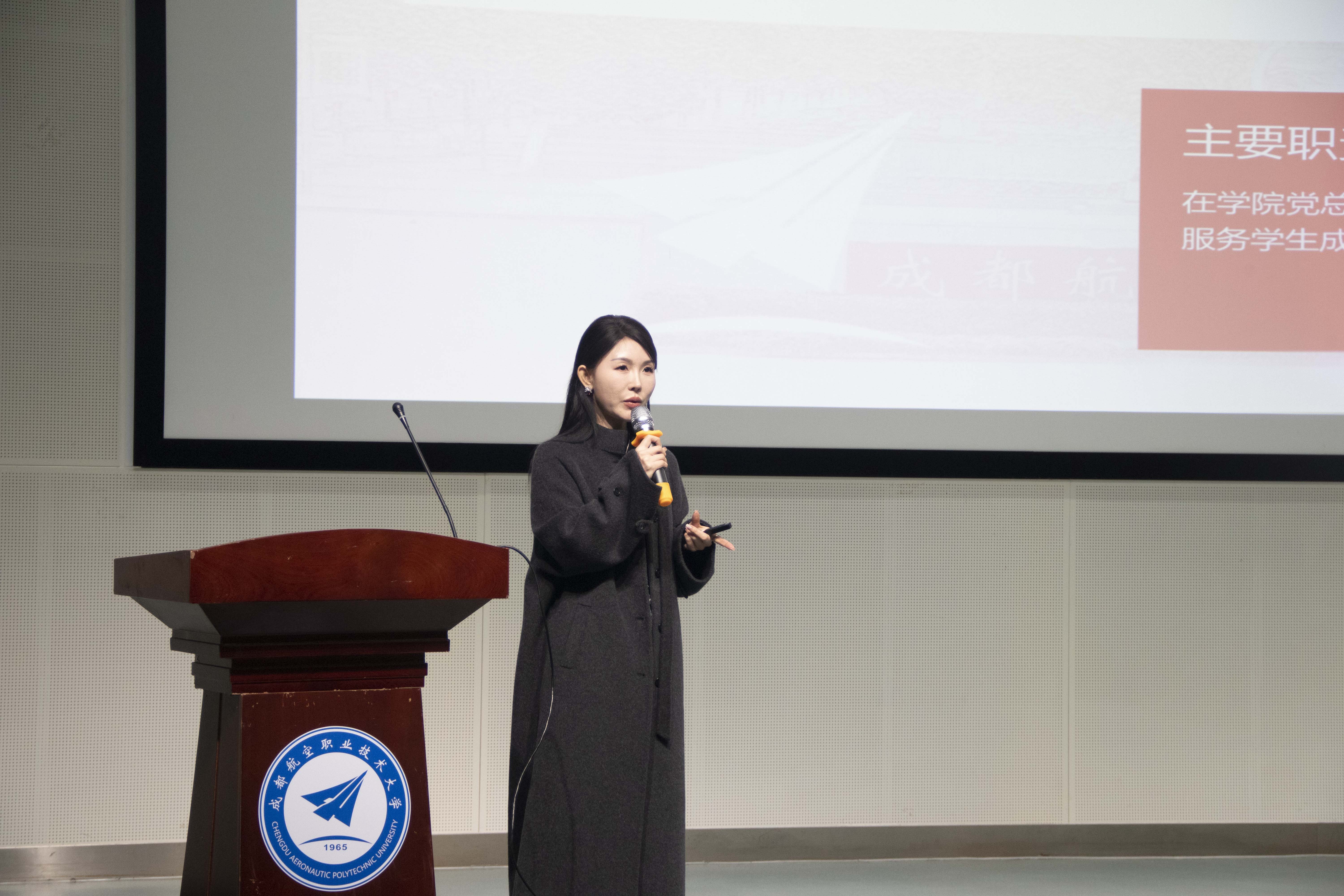 正在团委挂职锻炼的民航运输学院青年教师赵茜随后对年度重点工作进行全面回顾。她从思想教育引领、基层团组织建设、校园文化活动、志愿服务品牌等方面,梳理全年工作脉络与成果数据:既肯定团学组织在服务学校发展、引领青年成长中的关键作用,也指出资源整合不足、活动覆盖面有限等问题,为下一阶段团学工作的提质升级指明清晰路径。