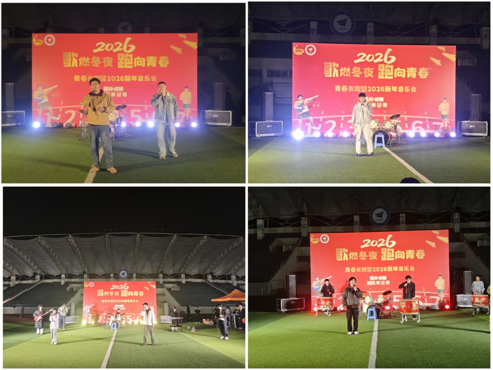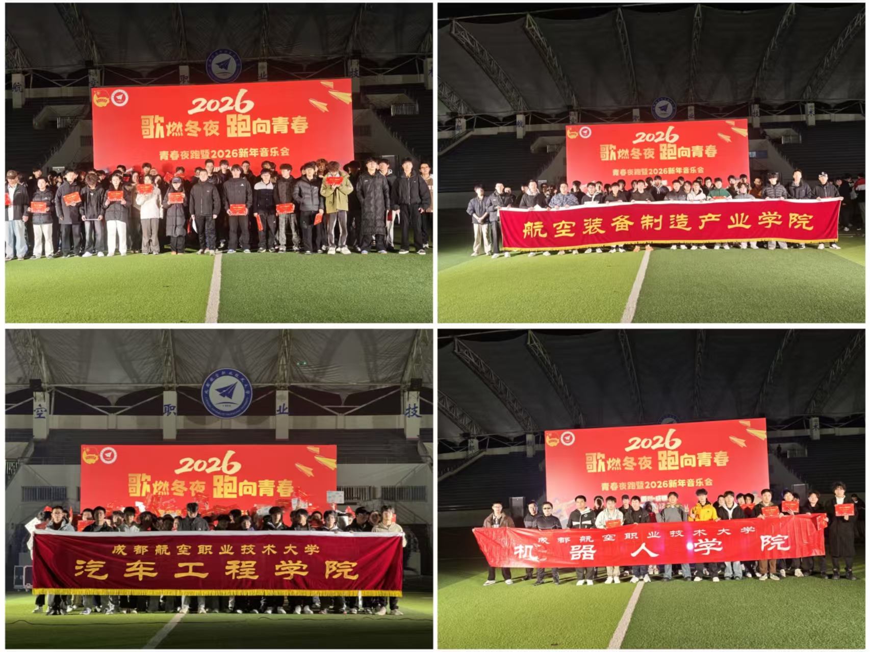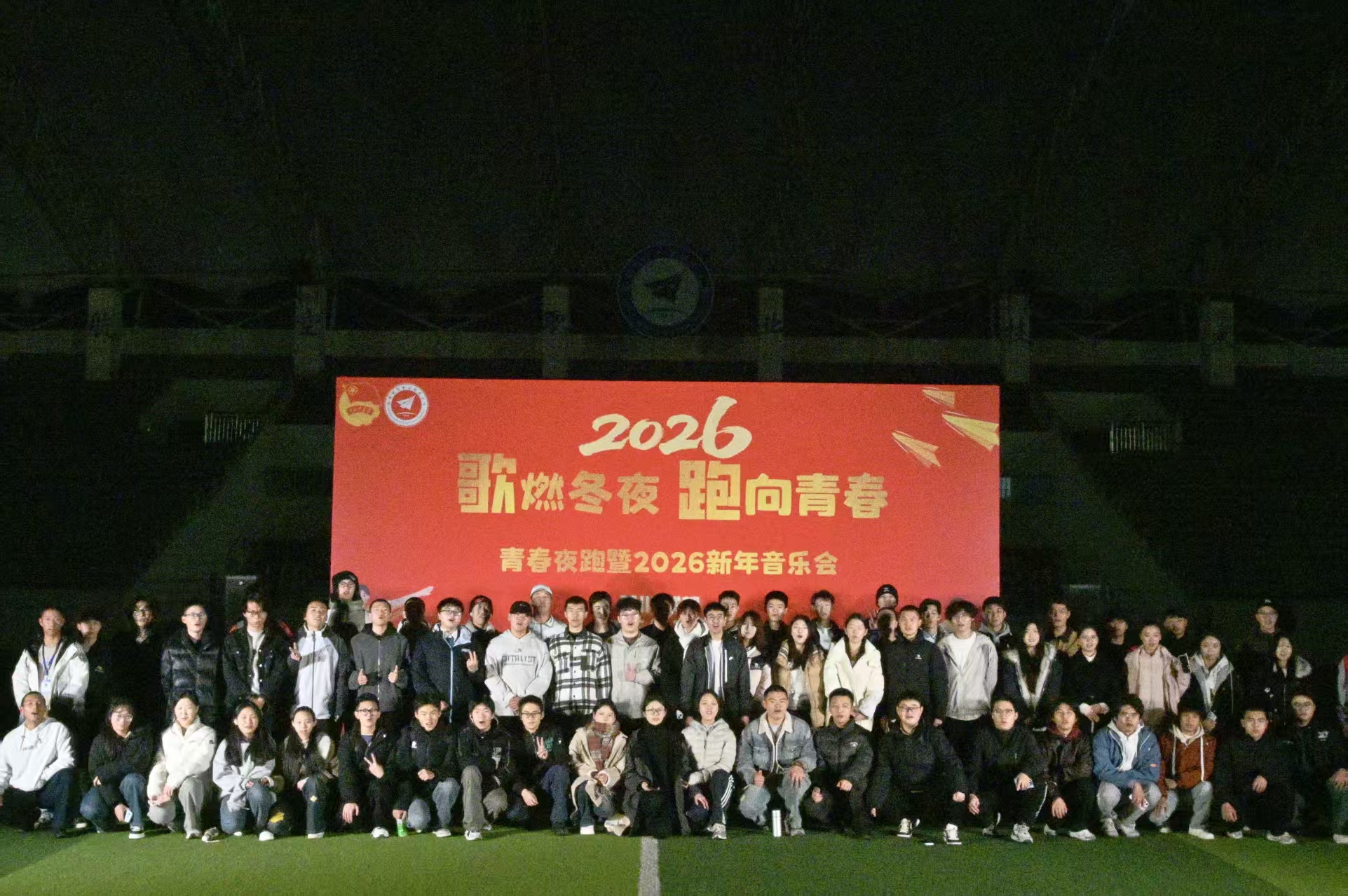 星夜燃歌,青春逐梦。为迎接2026新年,激发成航学子昂扬姿态,2025年12月30日晚,由团委社团服务中心主办的“歌燃冬夜 跑向青春”青春夜跑暨2026新年音乐会在龙泉校区操场活力启幕。1500余名师生汇聚绿茵场,跨越10个学院共赴青春之约;团委及电子工程学院、无人机产业学院、航空维修产业学院、民航运输学院等单位党委(党总支)负责人、学生工作负责人与团学指导老师全程参与,与青年学子并肩奔跑,以跃动之姿共启新年华章。