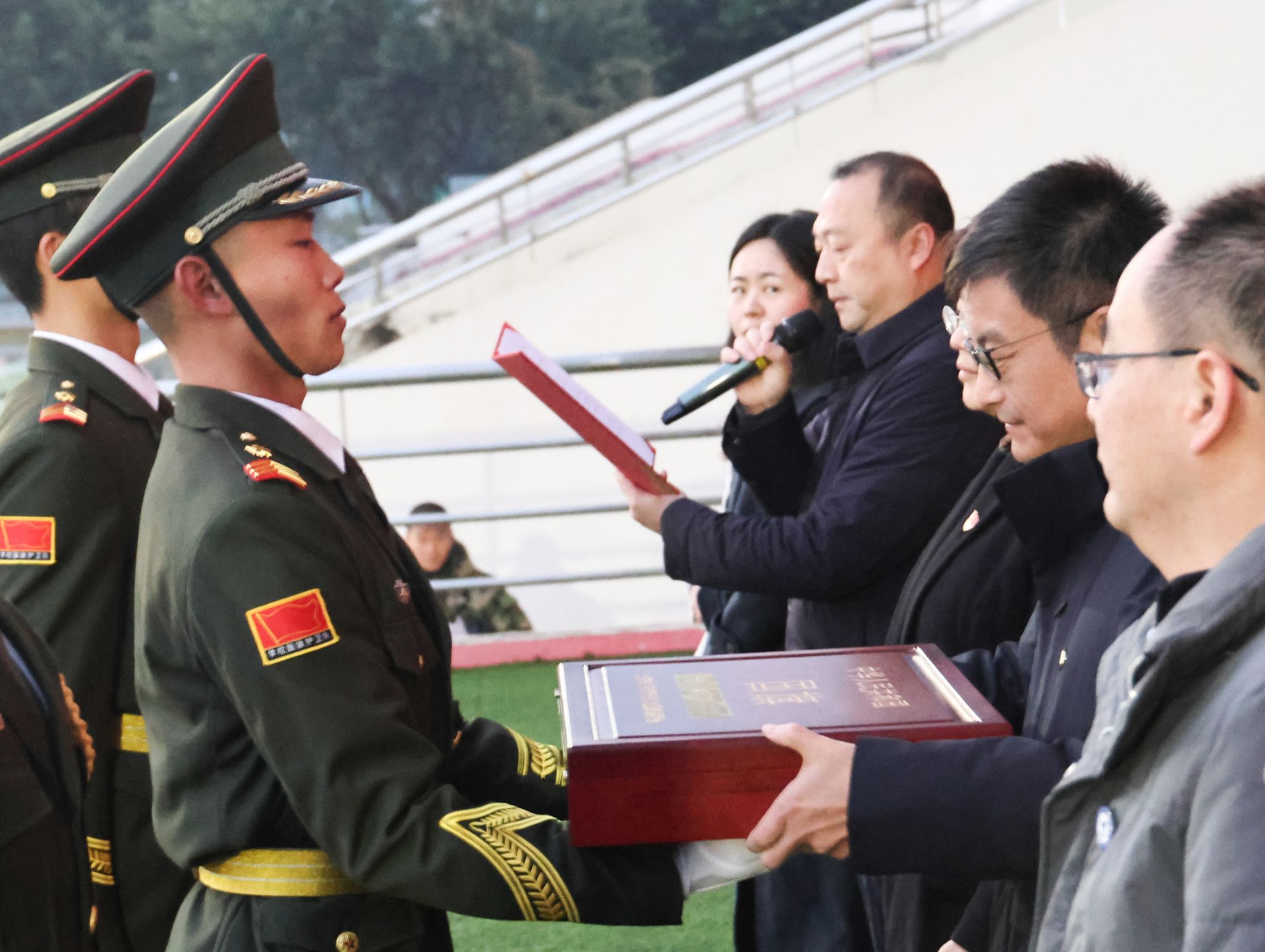 航空维修工程学院2024级学生、校国旗护卫队队长龚胡帅安作为学生代表发言。他结合日常训练经历,分享了护卫国旗的责任与使命,号召全体同学将爱国之情转化为精技报国的实际行动,在实训台前追求0.01毫米的精度,在技能学习中锤炼工匠精神。