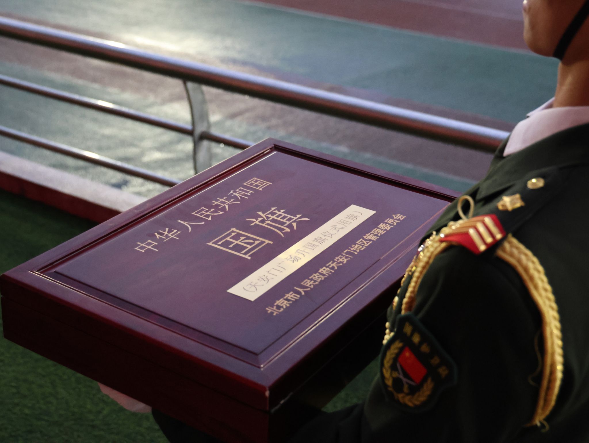 仪式最后,国旗护卫队队员庄重收旗、装盒。在全场师生齐声高唱《歌唱祖国》的歌声中,国旗护卫队队员护送天安门广场国旗前往校史馆永久珍藏。该面国旗将作为爱国主义教育的重要载体,在重要教育节点和重大活动中庄严展示。