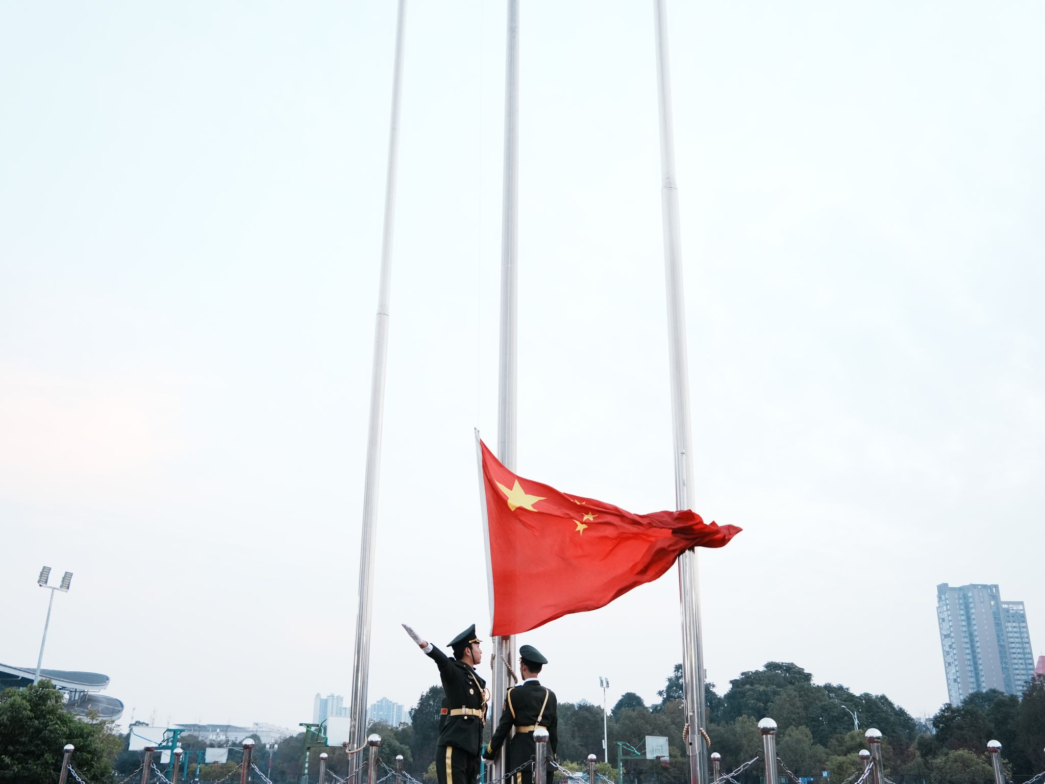 仪式在庄严的氛围中拉开帷幕。7时50分,国旗护卫队队员列队登上主席台,从侯孟书校长手中庄重接过国旗礼盒。随后,6名护旗手展开国旗,沿足球场中轴线正步行进展示。全体师生肃立注目,向这抹永恒的中国红致以最深切的敬意。