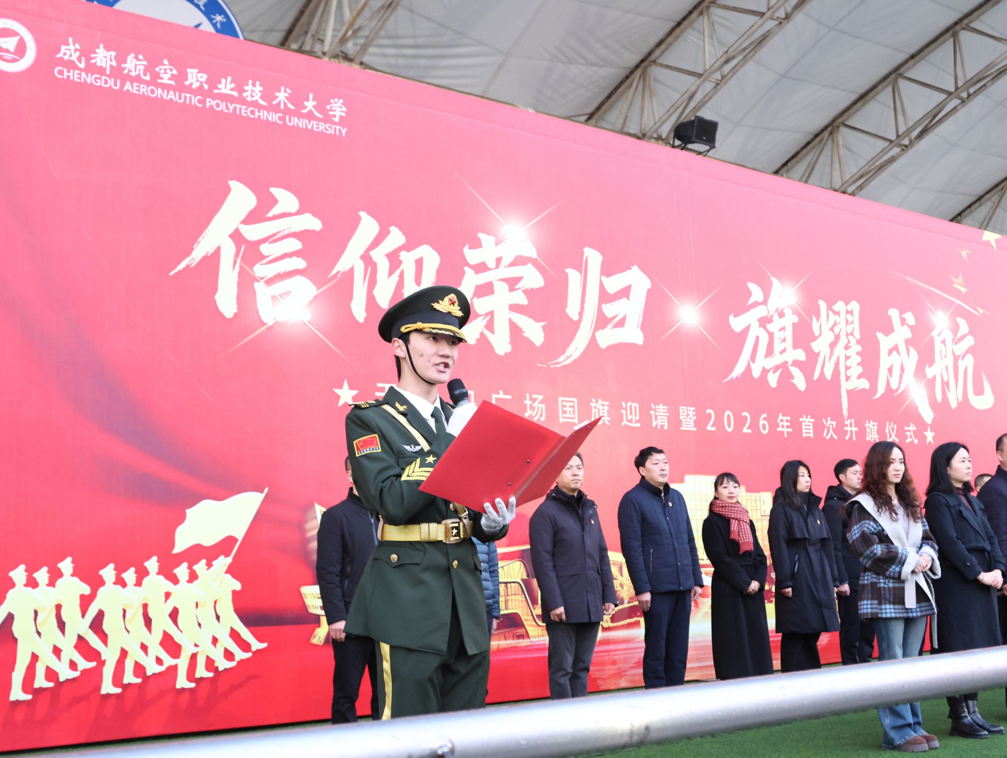 岁序更替启新程,红旗飘扬映初心。2026年1月4日清晨,成都航空职业技术大学“信仰荣归·旗耀成航”——天安门广场国旗迎请暨2026年首次升旗仪式在龙泉校区运动场隆重举行。成都航空职业技术大学党委书记陈小红,党委副书记、校长侯孟书出席仪式,仪式由党委副书记谢亮冯主持。
