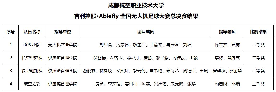 在校党委的坚强领导和校团委的统筹部署下,自1月赛事筹备以来,学校面向全校广泛动员、精心遴选。最终由供应链管理学院(“长空织梦队”、“长空逐梦队”、“破空之翼队”)与无人机产业学院(“308小队”)组建4支代表队出征。经激烈角逐,我校学子捷报频传:无人机产业学院“308小队”勇夺一等奖;供应链管理学院“长空织梦队”、“长空逐梦队”双双荣获二等奖,“破空之翼队”荣获三等奖。此次参赛实现了我校在该项赛事上的历史性突破,充分彰显了成航学子昂扬的风貌与专业实力。