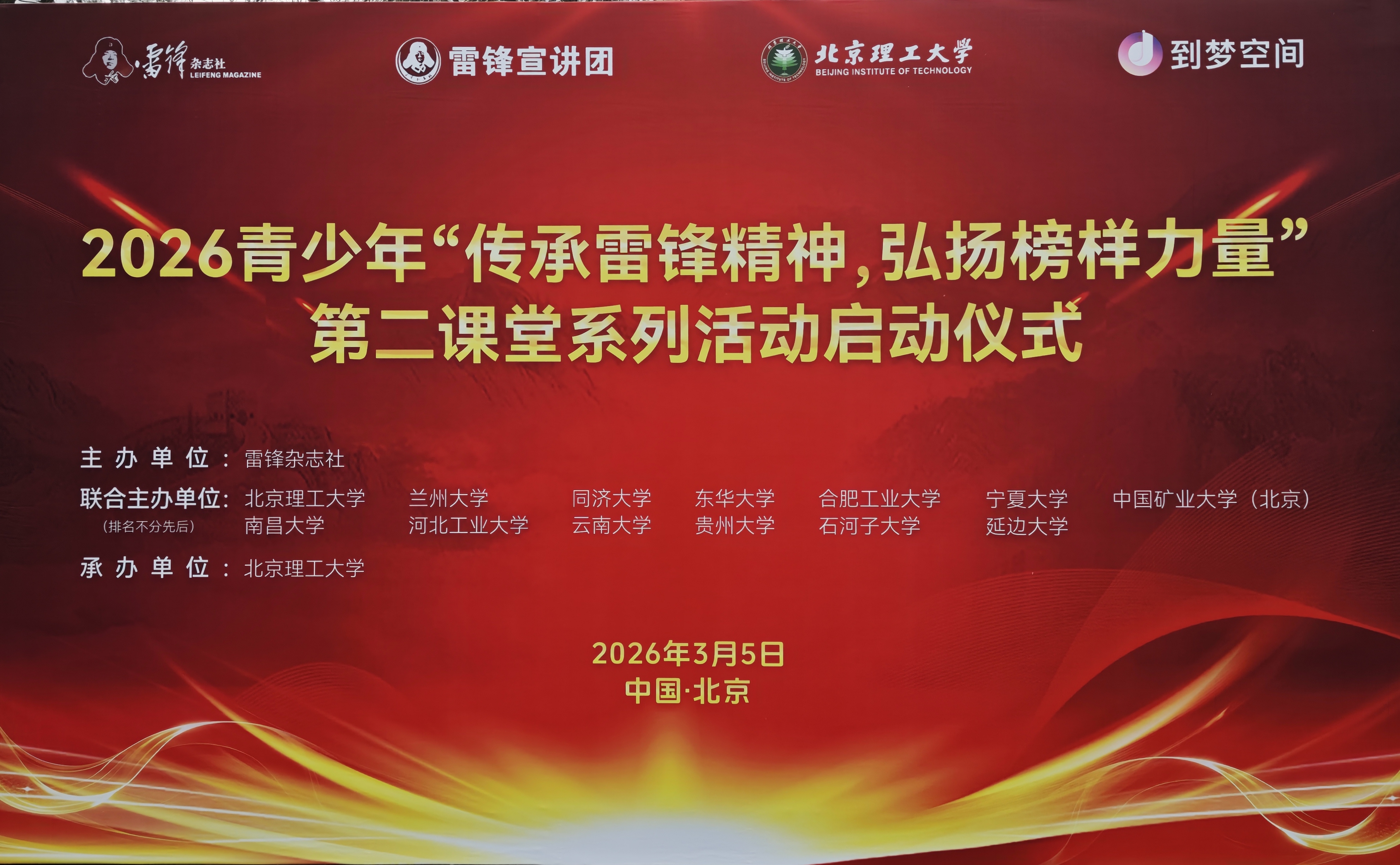 3月5日,正值第63个“学雷锋纪念日”、第27个“中国青年志愿者服务日”之际,2026青少年“传承雷锋精神,弘扬榜样力量”第二课堂系列活动启动仪式在北京理工大学温暖启幕。本次活动由雷锋杂志社主办,北京理工大学、同济大学等13所高校联合主办,以“雷锋精神进校园”为主题,汇聚全国高校及志愿服务单位的近百位嘉宾齐聚一堂,共同探讨雷锋精神的时代内涵与育人价值。我校受邀出席本次启动仪式,并光荣获聘为“雷锋精神宣传大使”单位,团学教师代表巫瑞参加活动并上台受聘。