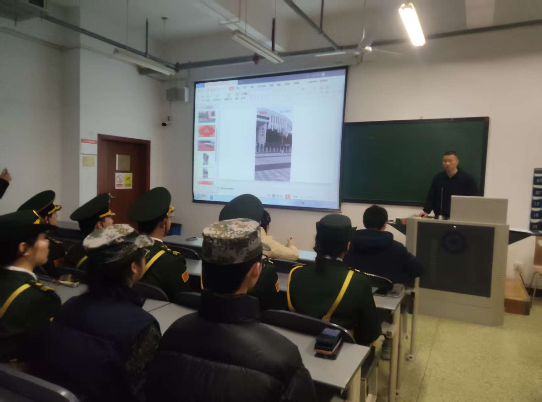 活动中,全体队员共同回顾了开学以来的重点工作。3月9日,国旗护卫队以整齐划一的队列和昂扬饱满的精神面貌,圆满完成两校区新学期首次升旗仪式,为全校师生树立了爱国进取的精神榜样;同时,队伍积极履行社会责任,受邀前往东华幼儿园、柏合幼儿园开展升旗示范活动,以庄重的仪式感在孩子们心中播下爱国种子,充分展现了成航青年服务社会的专业形象与责任担当。为对标高标准、补齐短板,仪式现场组织观摩了多组教学视频,从我校以军士生为主体的国旗护卫队备战国赛的汗水纪实,到三军仪仗队威武雄壮的国家名片,再到兄弟院校广东医科大学斩获全国一等奖的精湛表现,队员们通过“身边榜样、国家标准、同行先进”多维度学习,深入查找在队列配合与细节把控上的差距,进一步激发了“见贤思齐、追求卓越”的训练热情。随后,国旗护卫队骨干徐雪东详尽讲解了新学期整体工作安排,从严谨的训练课目到严格的考核机制,从日常纪律要求到重大任务部署,一份清晰的“路线图”确保了各项工作有章可循、规范高效。