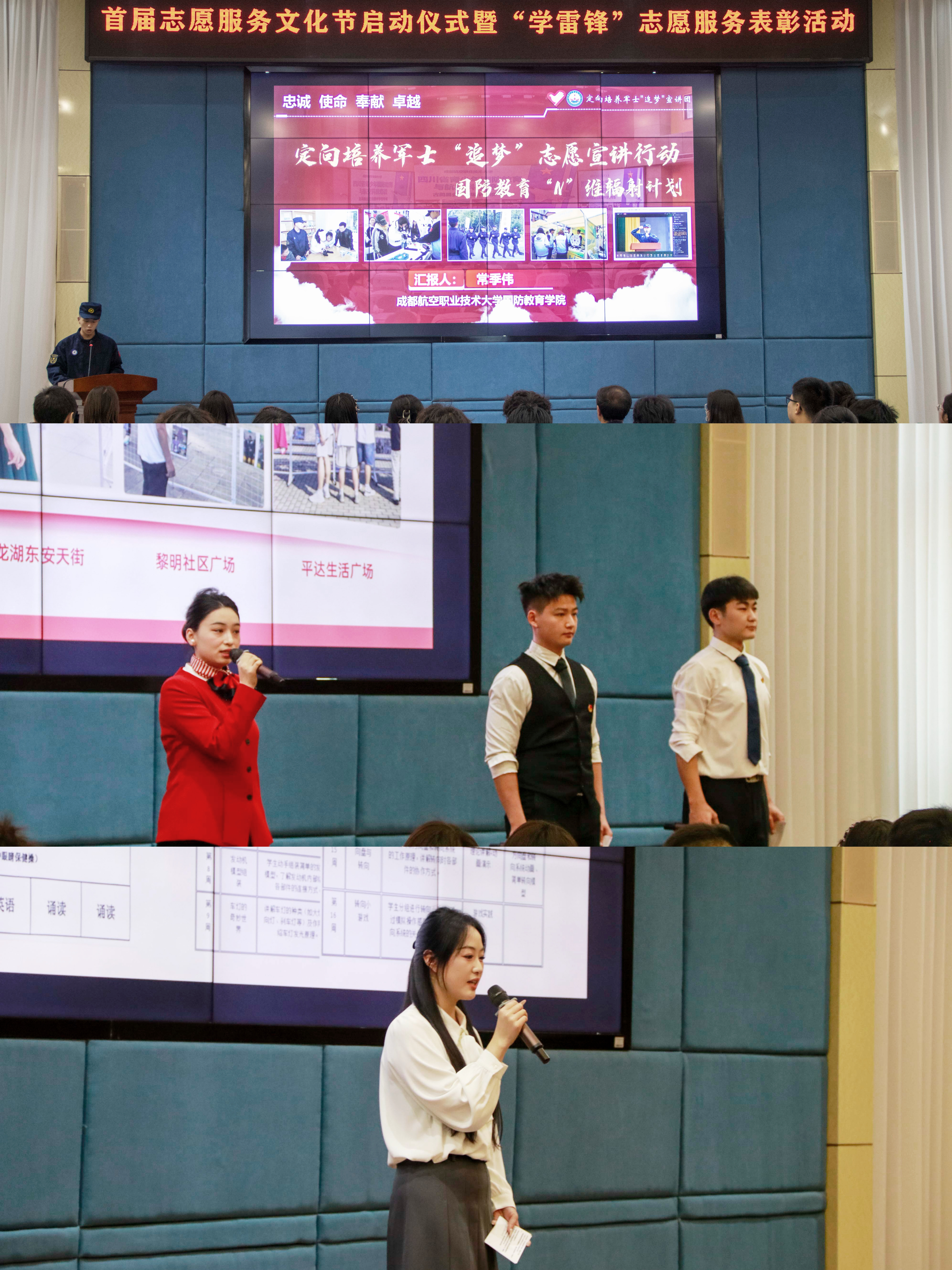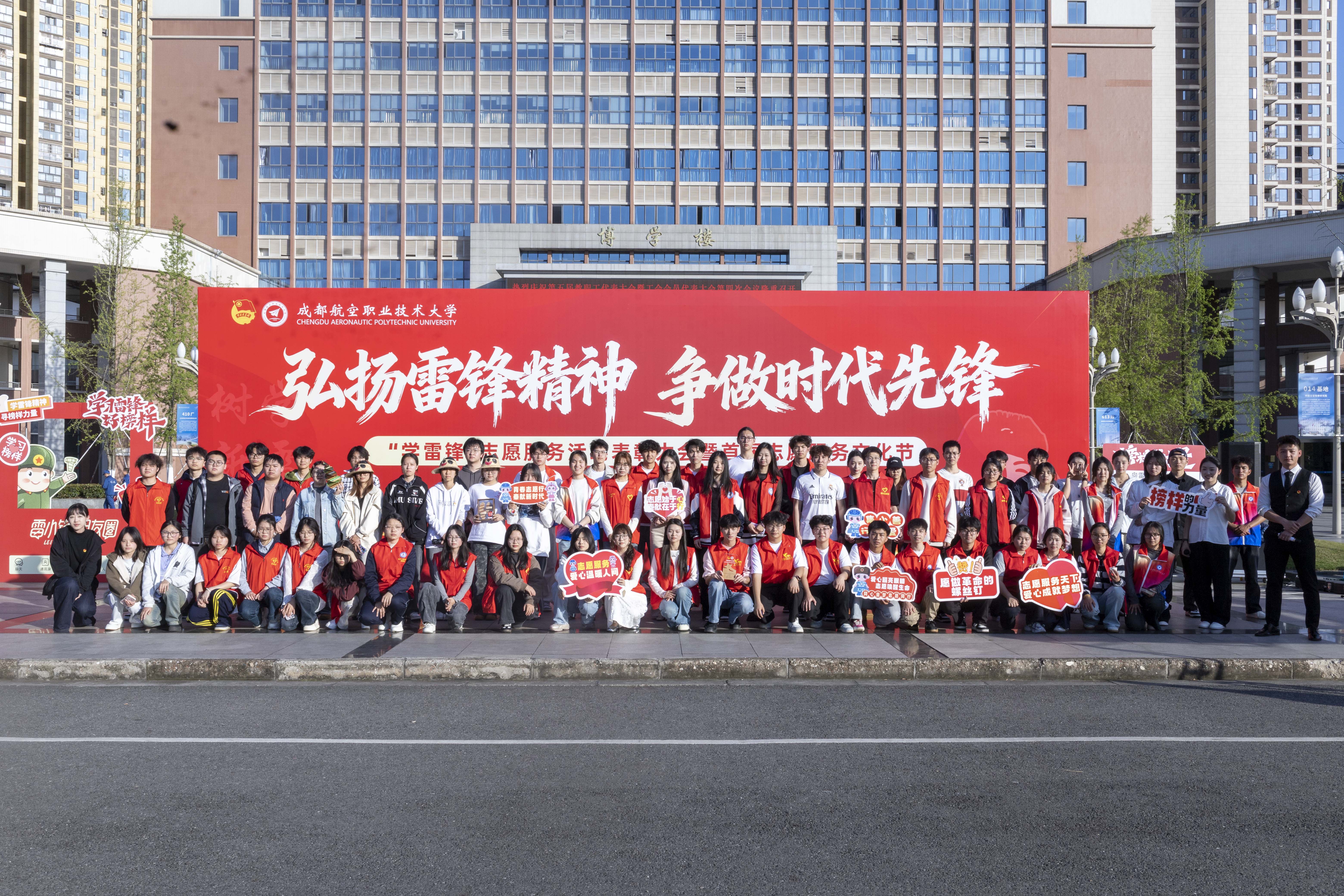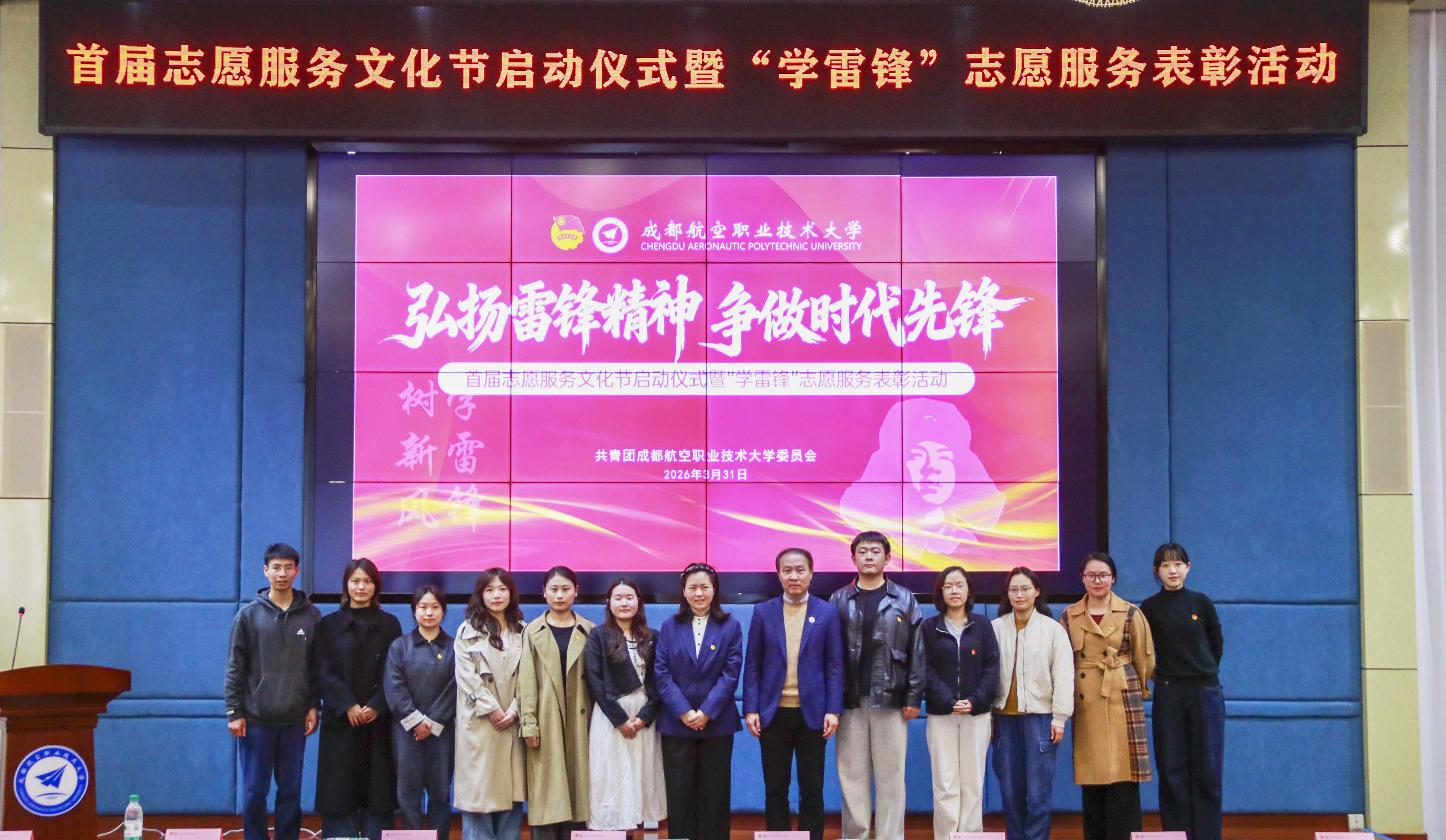 3月31日,为深入落实立德树人根本任务,推进志愿服务融入人才培养全过程,成都航空职业技术大学“学雷锋”志愿服务活动表彰大会暨首届志愿服务文化节在求实报告厅与博学楼前广场隆重举行。本次活动以“弘扬雷锋精神 争做时代先锋”为主题,集中展示学校志愿服务育人成果,表彰先进典型,开启首届志愿服务文化节序幕。学校党委副书记谢亮冯出席活动,党委学生工作部、校团委负责人,各二级学院团总支书记及近300名师生志愿者代表共同参与本次活动。