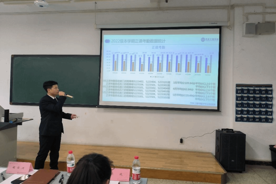 大会最后,陈佳书记进行总结发言。陈佳对汽车工程学院团总支、学生会的工作表示肯定,对班级考勤小组和各位同学的努力表达了衷心的感谢,对本学期班级平均出勤率稳步提升,提出了表扬。同时她指出整体出勤率虽然有所提升,但仍有部分同学对考勤制度不够重视,存在迟到、早退等现象,希望同学们通过本次常规总结大会做出更多的调整和改变。