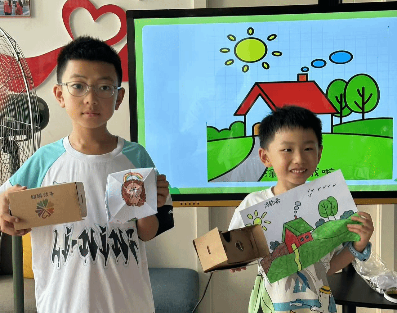 在绘画环节,志愿者们示范简笔画技巧,引导孩子们设计心中的绿色建筑。彩笔下,一栋栋充满想象力的房子跃然纸上:有的屋顶铺满太阳能板,有的外墙爬满绿植,还有的安装了雨水收集装置。经过评选,志愿者为获得“最佳绿色房子绘画”的小朋友颁发了手工制作的 VR 眼镜模型,寓意“用新视角探索绿色世界”,现场洋溢着欢乐的氛围。