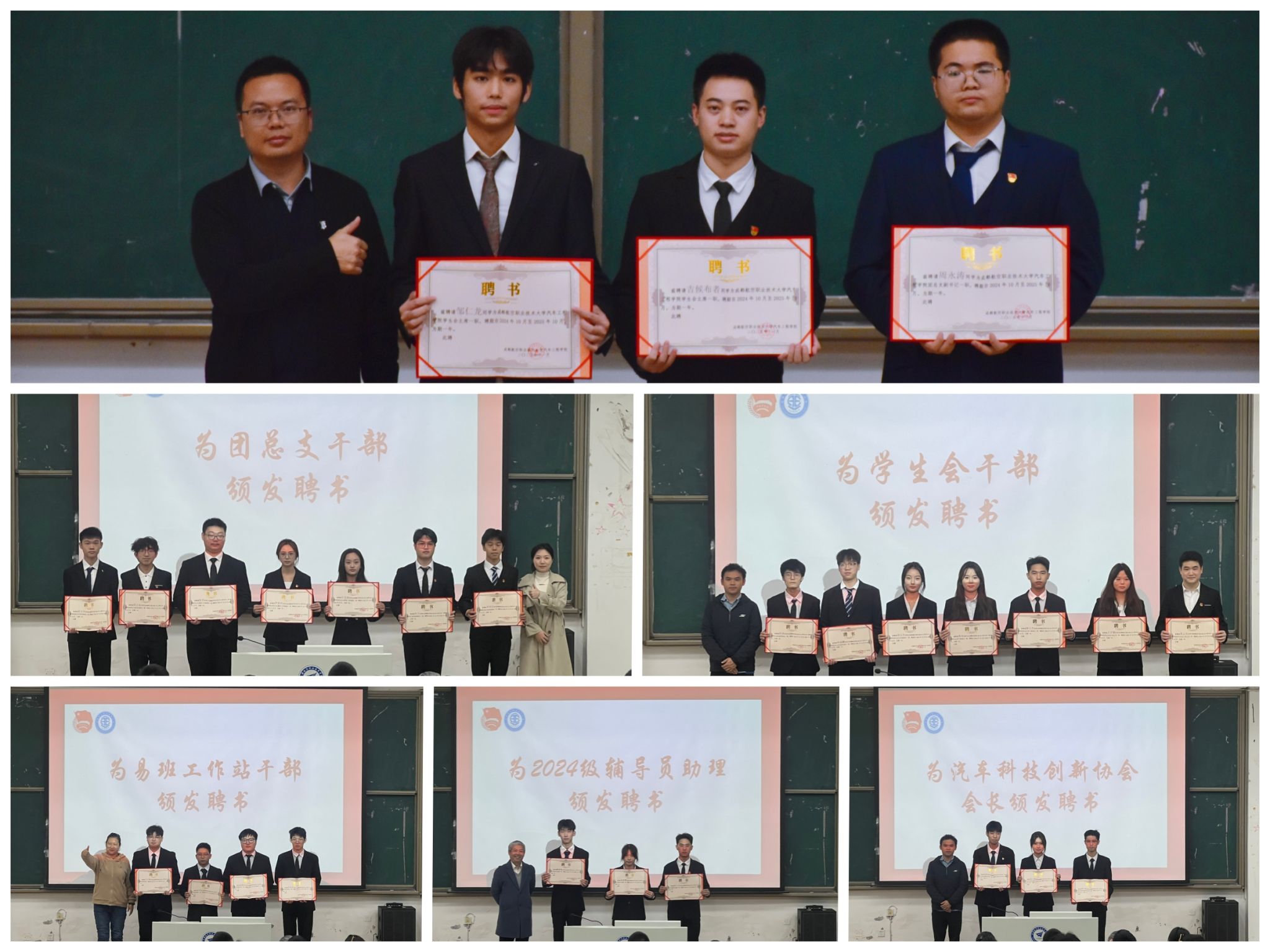 在颁发聘书和授牌环节,老师们为团学组织主席团成员、团总支干部、学生会干部、易班工作站干部、汽车科技创新协会会长以及2024级辅导员助理颁发聘书,为新一届团学组织干部以及第一届学生组织干事授牌授牌,以强化责任担当,激励学生干部干事践行"以热爱赴使命"的青春宣言。