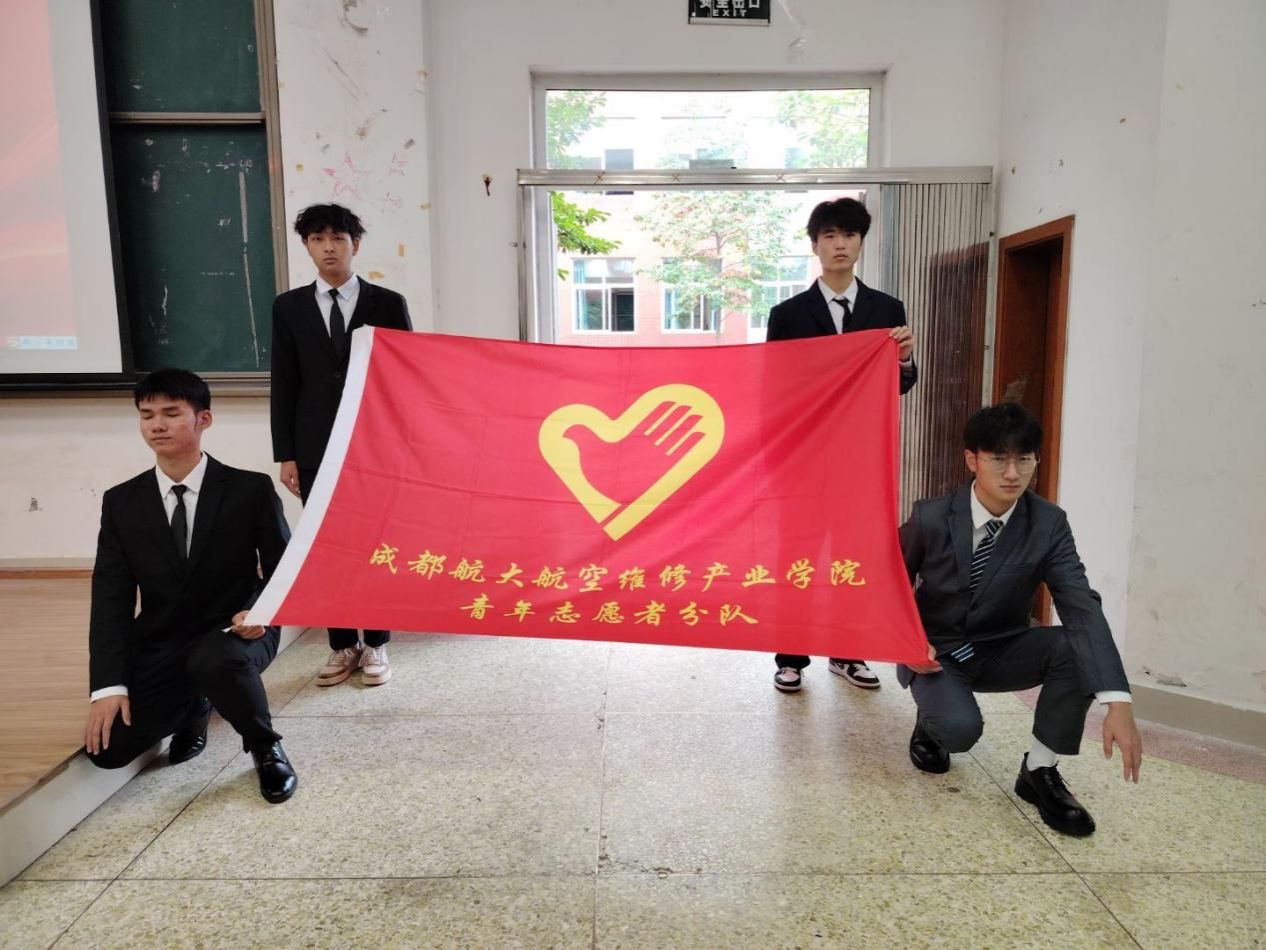 “我志愿成为一名光荣的青年志愿者……”在鲜艳如火、象征着奉献与热情的队旗下,四位志愿者代表展开了印有“航空维修产业学院青年志愿者分队”金色大字的队旗。这一刻,庄重而充满希望,仿佛有无形的力量在凝聚、在升腾。这面旗帜不仅代表着荣誉,更承载着深厚的志愿精神和无私的奉献理念。