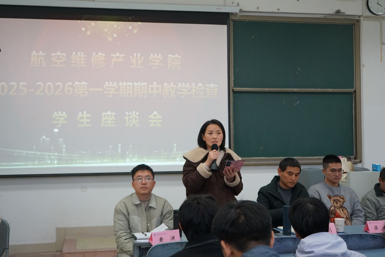 为深入了解学院教学运行情况,及时发现并解决教学过程中的问题,切实提升教学质量、加强学风建设,促进师生间沟通交流,11月25日,航空维修产业学院在尚学楼组织召开了2025-2026学年第一学期期中教学学生座谈会。航空维修产业学院教学负责人葛剑、军士管理学院行政负责人梁潘、各专业教研室主任、教师代表,以及学院各班学生代表、军士管理学院相关专业班级学生代表共同参会。