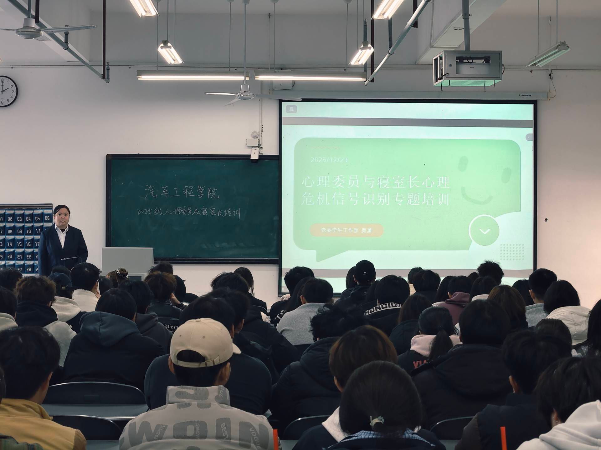 为深入落实《成都航空职业技术大学学生骨干培训实施方案》要求,持续强化学校心理健康教育工作队伍建设,提升学生心理骨干的专业素养与实操能力,掌握心理健康知识与朋辈帮扶技巧,12月23日,汽车工程学院积极组织心理工作负责老师、相关学生骨干、2025级班级心理委员及寝室长共150余名师生集中参加了由学校党委学生工作部举办的“领航成长训练营之2025级寝室长与心理委员专项培训”,以实际行动筑牢校园心理健康“第一道防线”。