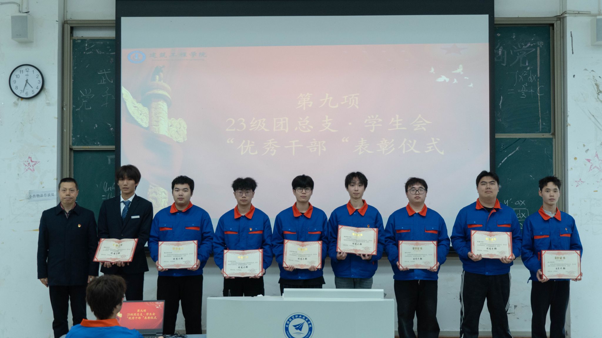 在热烈的掌声中,与会教师为24级团总支、学生会成员授牌,为23级成员颁发聘书,一张张证书与牌匾不仅是对学生干部过往付出的肯定,更是对未来工作的期许。余彦滨为23级团总支·学生会优秀干部颁发表彰证书,鼓励全体学生干部以榜样为引领,继续发光发热。