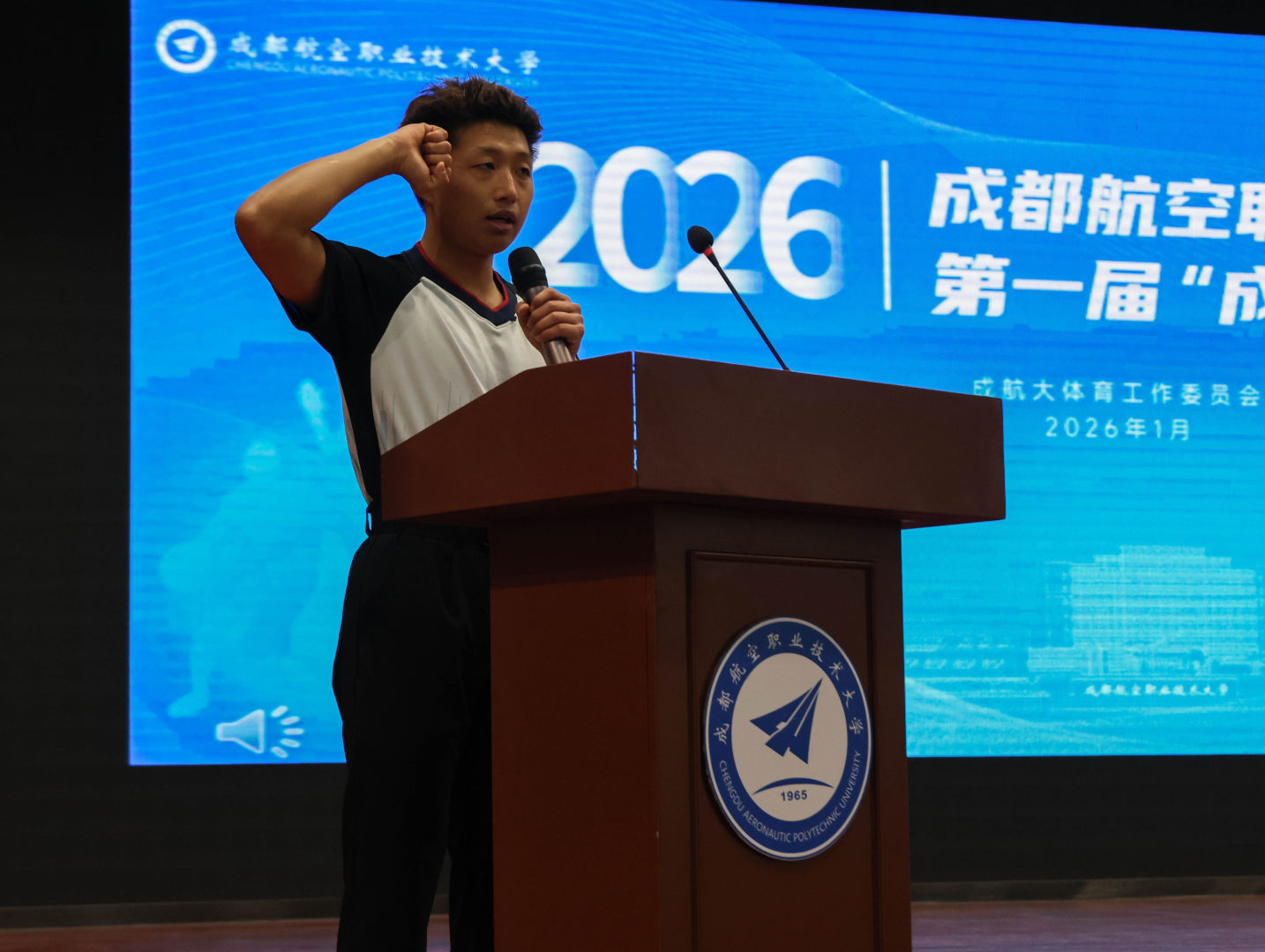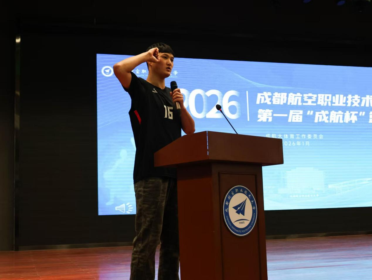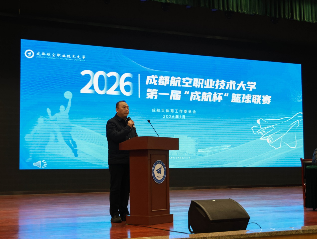 开幕式上,校领导谢亮冯副书记发表致辞。他首先代表学校对首届“成航杯”篮球联赛的顺利开幕表示热烈祝贺,向精心筹备赛事的工作人员、踊跃参赛的各代表队致以诚挚问候。他指出,篮球运动承载着拼搏进取、团结协作的体育精神,与学校“明德、笃行、求实、创新”的校训精神高度契合;首届“成航杯”篮球联赛的举办,既是学校深化校园体育文化建设的重要举措,也是为成航学子搭建切磋技艺、增进友谊、锤炼品格的优质平台。作为航空航天领域高素质技术技能人才培养基地,学校始终坚持以体育人,让学子在运动中强健体魄、在竞技中磨砺意志,希望全体运动员赛出风格、赛出水平、赛出友谊,将赛场上的热血拼搏转化为学业上的奋进动力,以青春之力践行航空报国初心,并宣布成都航空职业技术大学首届“成航杯”篮球联赛正式开幕。