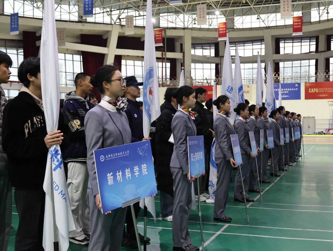 晚上18时,开幕式在激昂的音乐中正式拉开帷幕。各学院参赛代表队身着整齐队服,迈着铿锵有力的步伐依次入场,队员们精神抖擞、斗志昂扬,嘹亮的口号响彻场馆,充分展现出成航学子朝气蓬勃、奋勇争先的青春风采。入场完毕后,全场肃立,奏唱中华人民共和国国歌,雄壮的歌声中凝聚着全体师生的家国情怀与集体荣誉感。