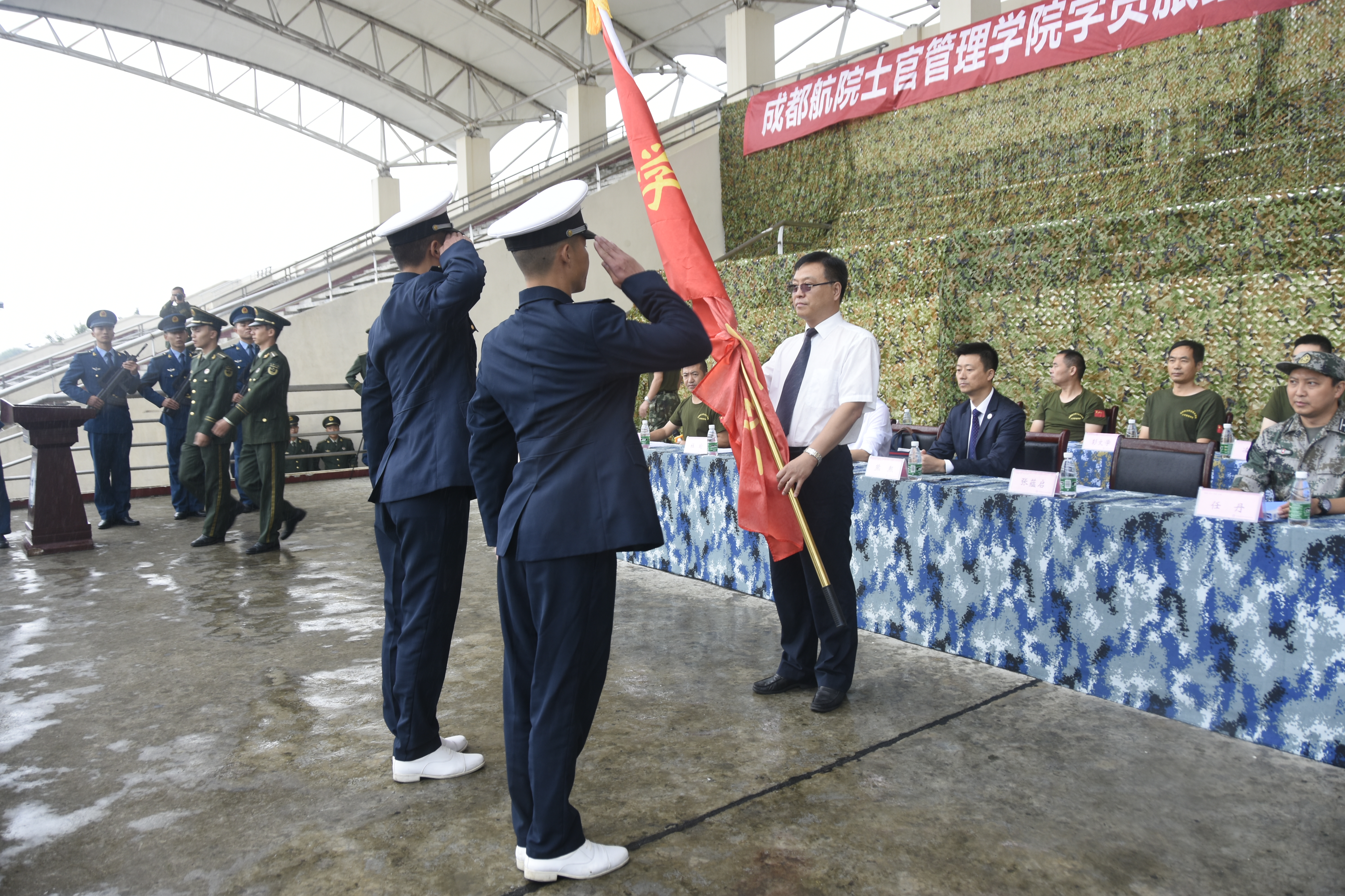 成都航院校长张蕴启分别为空军、海军、武警大队授旗