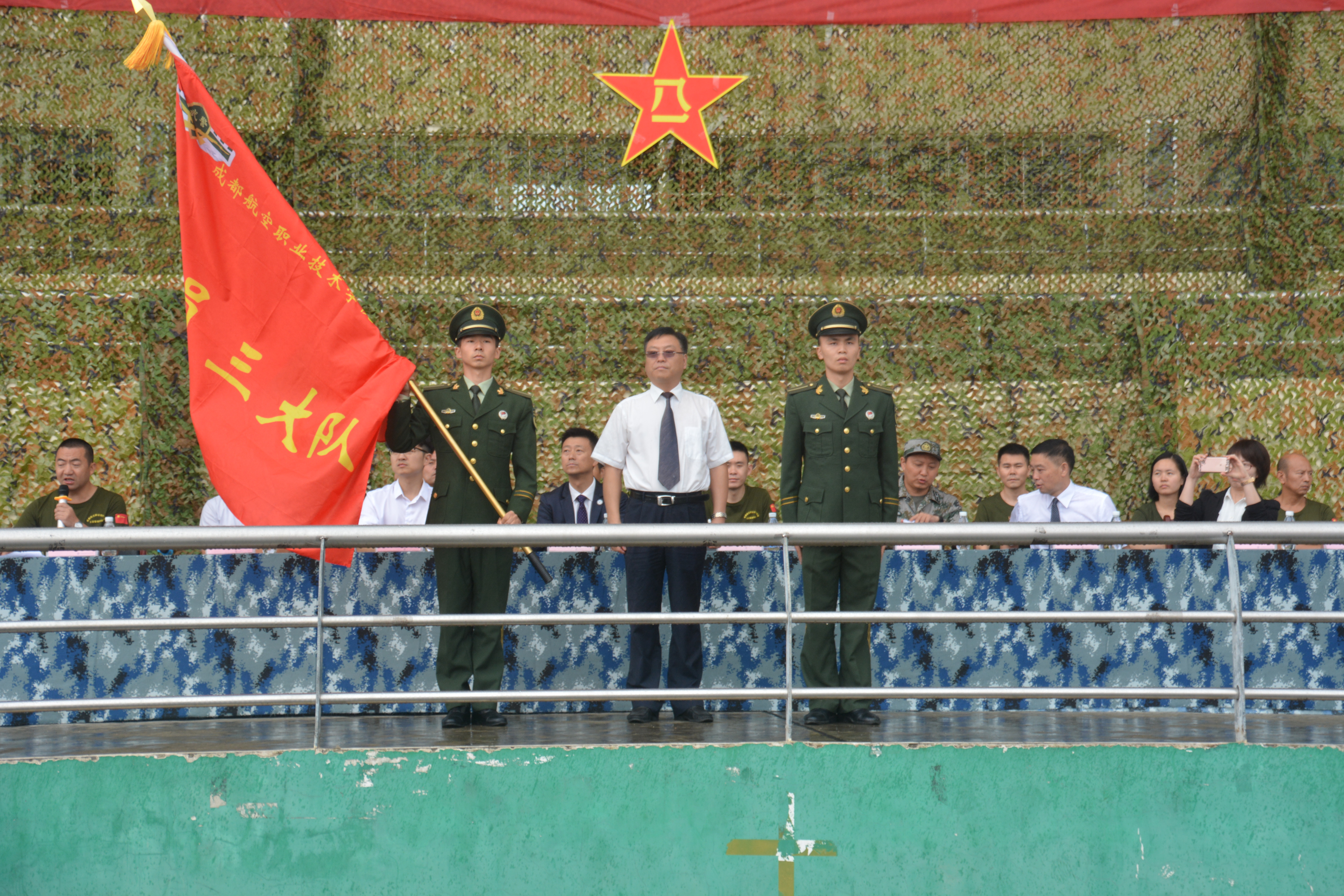 校长张蕴启分别为空军、海军、武警大队授旗,并与副校长熊熙、有关职能部门和各二级学院领导一起为党员佩戴党徽、为骨干佩戴臂章。