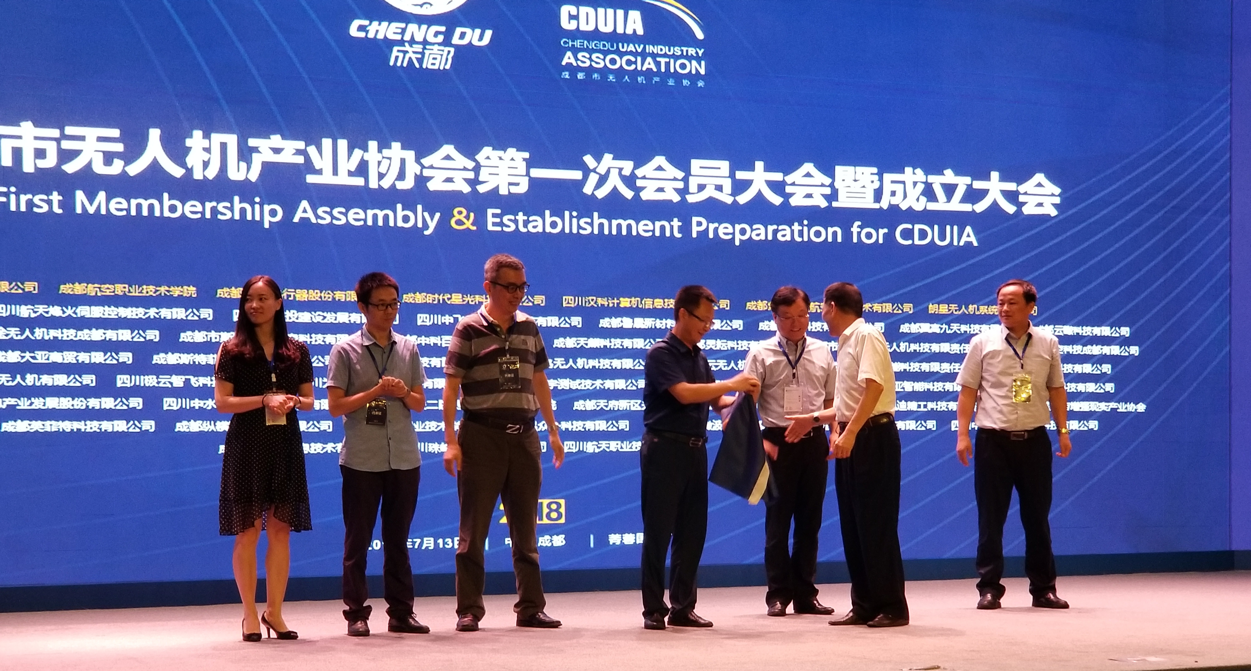 2018年7月13日,成都市无人机产业协会第一次会员大会暨成立大会在成都市高新区菁蓉国际广场召开,这是成都市首个无人机行业组织。校长张蕴启一行出席大会,并代表主要发起单位和当选副会长单位参加协会授旗仪式。