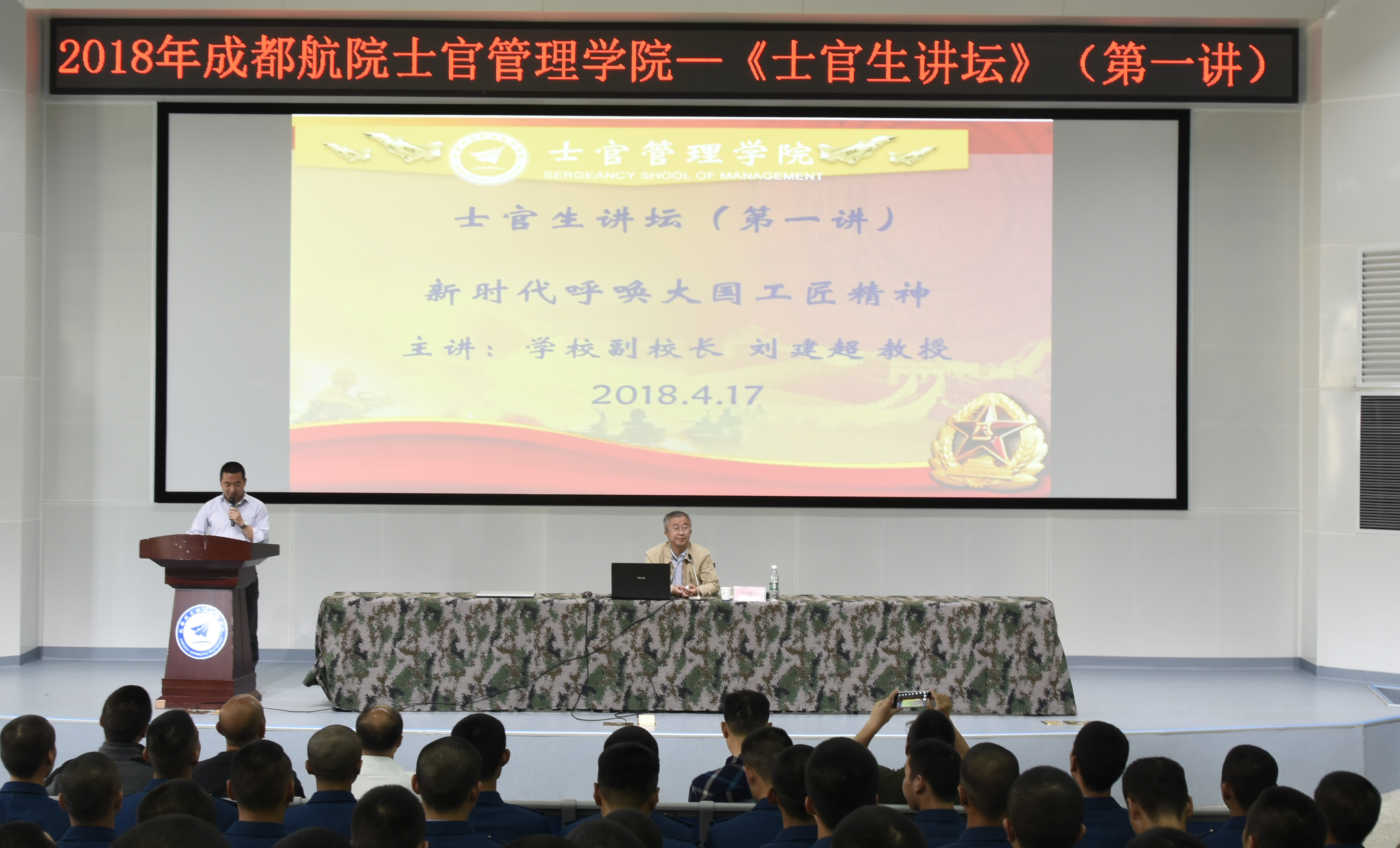 2018417日,学校副校长刘建超为士官管理学院《士官生讲坛》第一讲作《新时代呼唤大国工匠精神》专题讲座。士官管理学院全体教师,20162017级全体士官生近900人聆听讲座。讲座由学院党总支副书记、副院长梁潘主持。